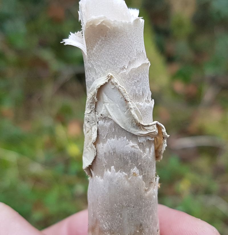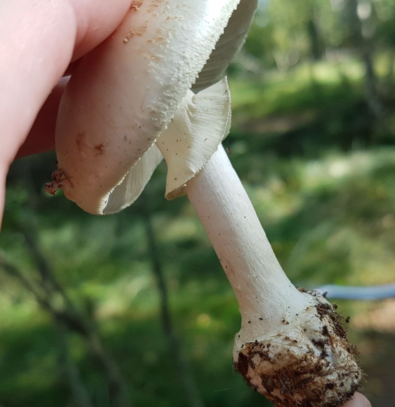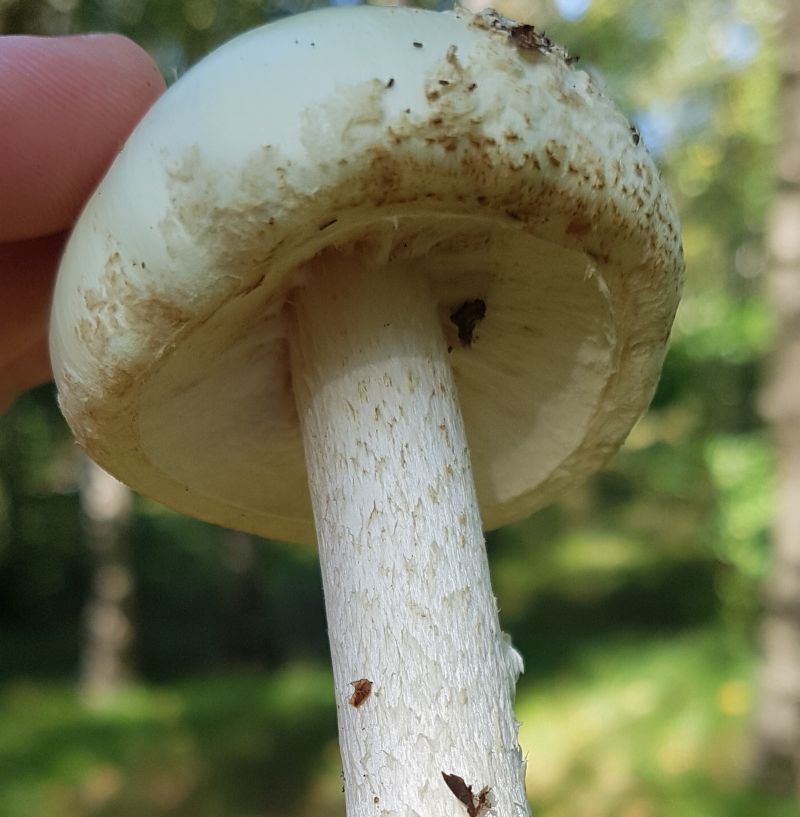 Glänzender Stiel, Flocken auf dem Hut, geriefte gelbe Manschette, Kellergeruch neutral (weder fies noch lecker). Soweit, so gut.