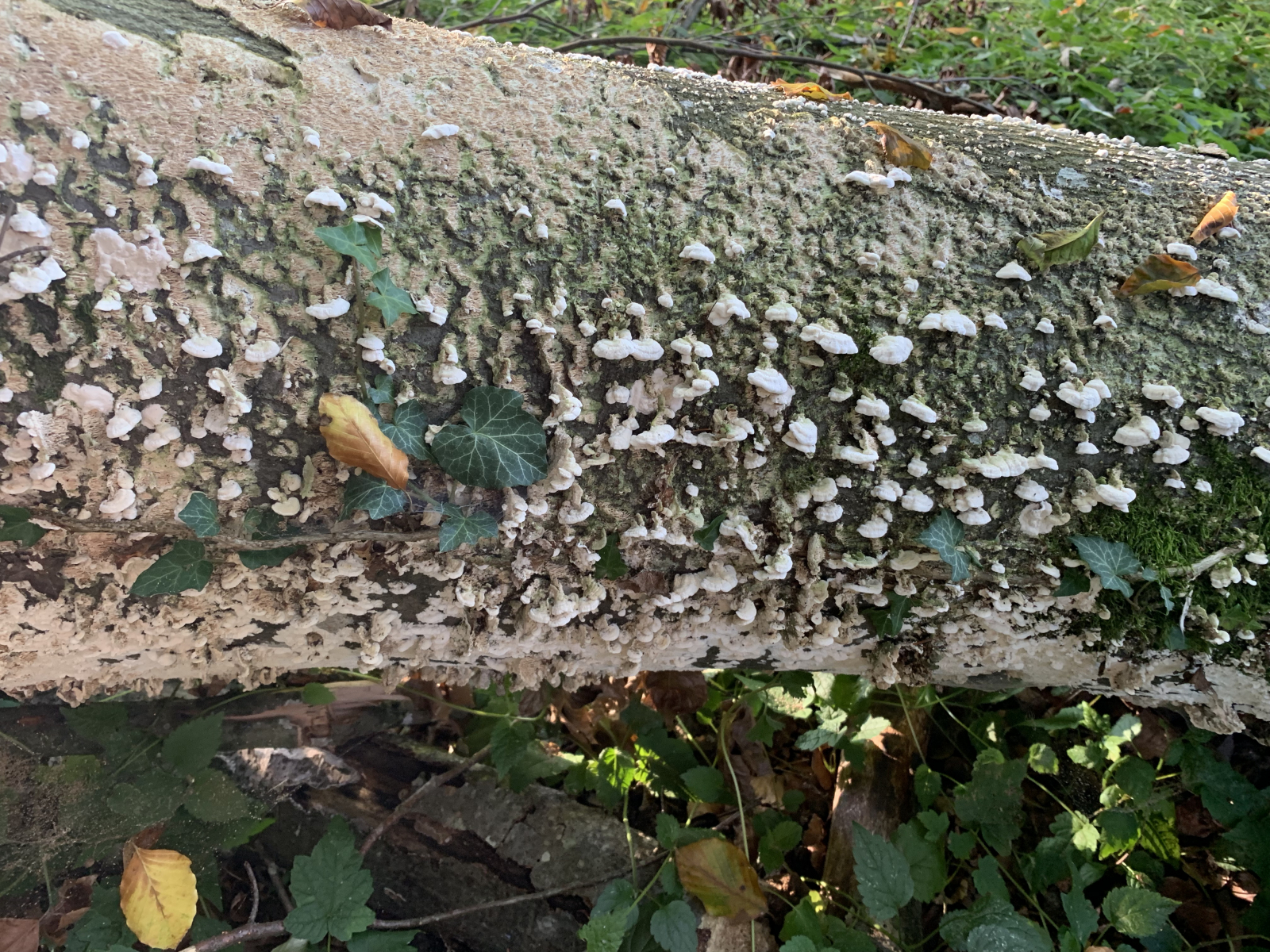 Ich bin nach wie vor am ehesten bei Irpex lacteus, der schon sehr ausgedehnte, große Fruchtkörper (bei geeigneten Bedingungen über mehr als einen Meter in der Ausdehnung) bilden kann.