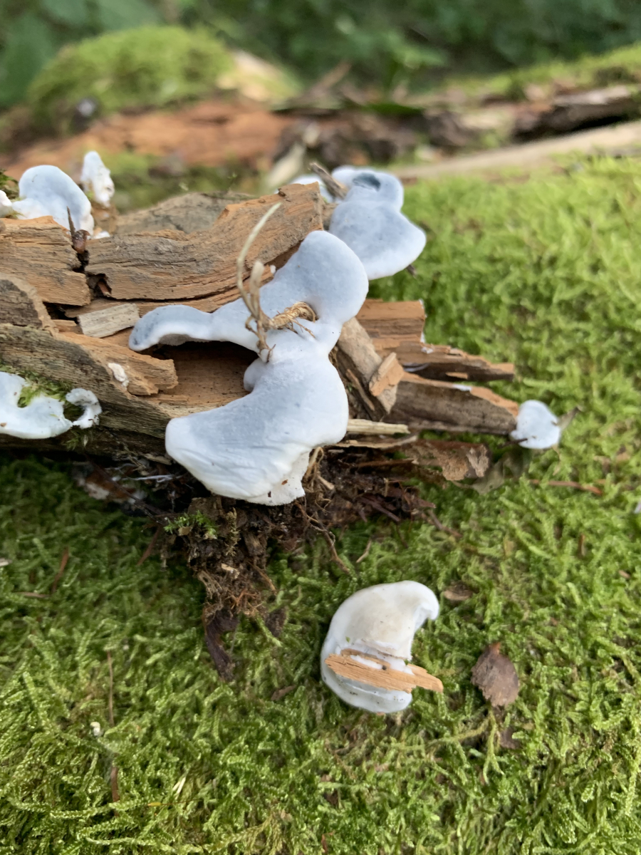 Nicht groß, ca. 5 cm max. jeder. Ich weiß es gibt einen blauen Porling - der ist es eher ich nicht. Ich kann das Holz nicht bestimmen, es ist schon sehr zerfallen. Aber ich vermute Ahorn. 😄