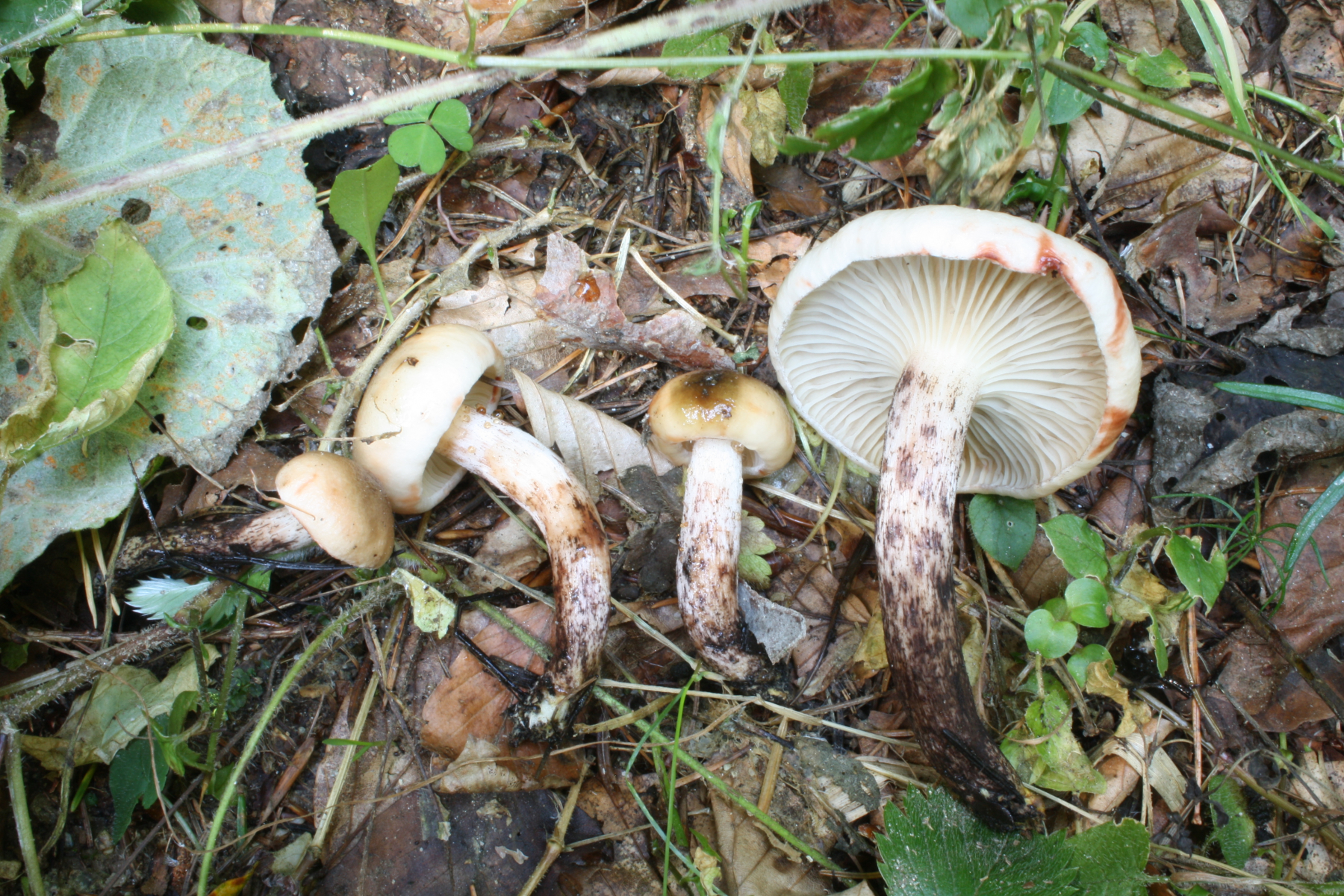 heute hab ich in einem Mischwald mit Fichte, Tanne, Föhre, Lärche und eingestreuten Laubbäumen einen sehr auffälligen Pilz gefunden, der mich an einen Schneckling erinnert... Er rötet bei Berührung, später werden die Druckstellen schwarz. Könnt ihr mir da bitte auf die Sprünge helfen?