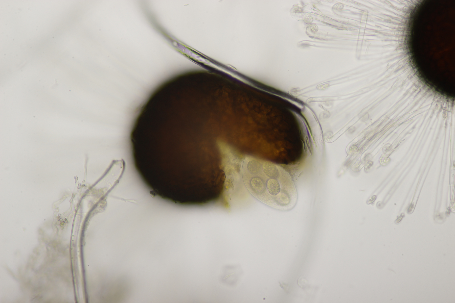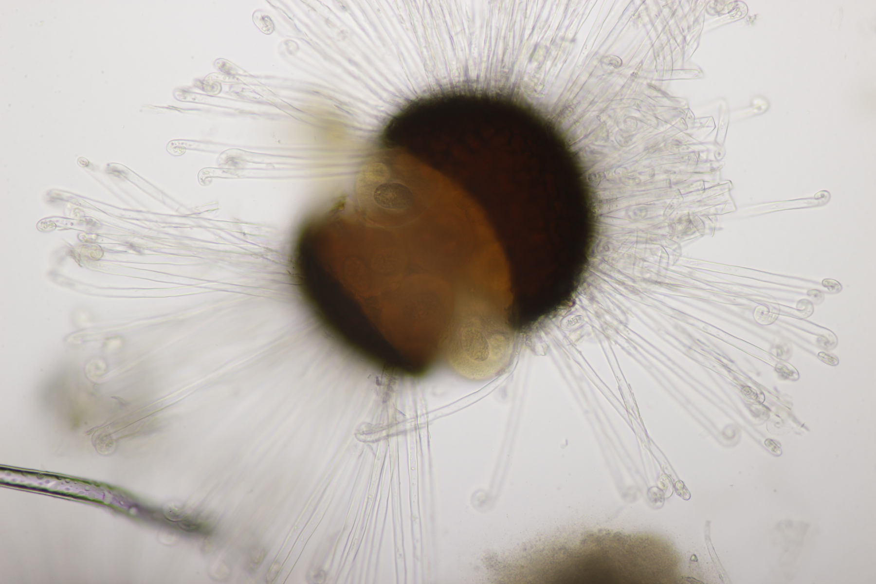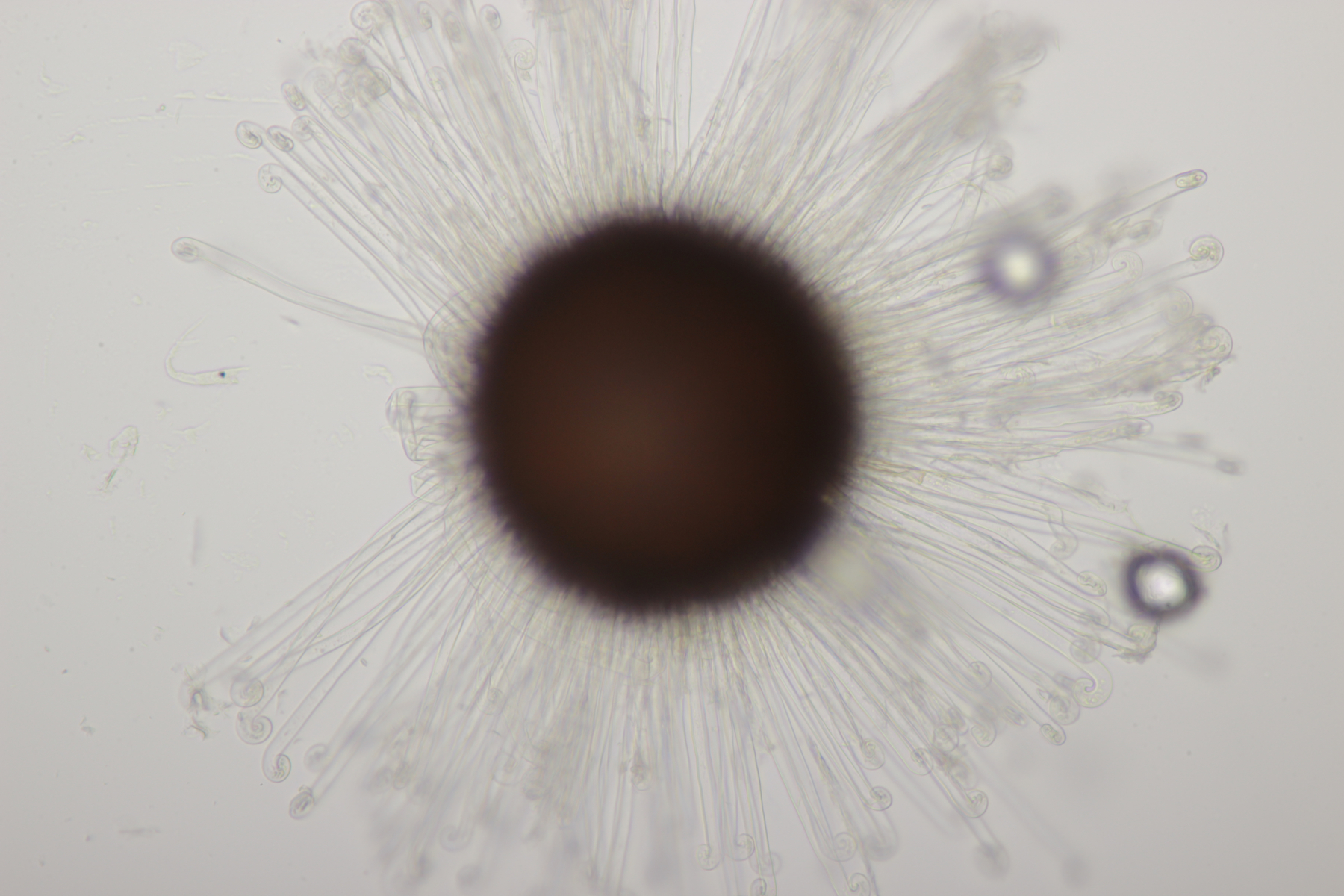 8. Und dann hat meine Mutter mir noch von ihrem Zitronenbaum erzählt, wo die Blätter abtrocknen und es kleine schwarze Beläge gibt. Unterm Mikroskop zeigten sich dann einerseits Alternaria-Sporen, andererseits auch diese Konidien hier. Viellecht hat da ja jemand eine Idee zu?