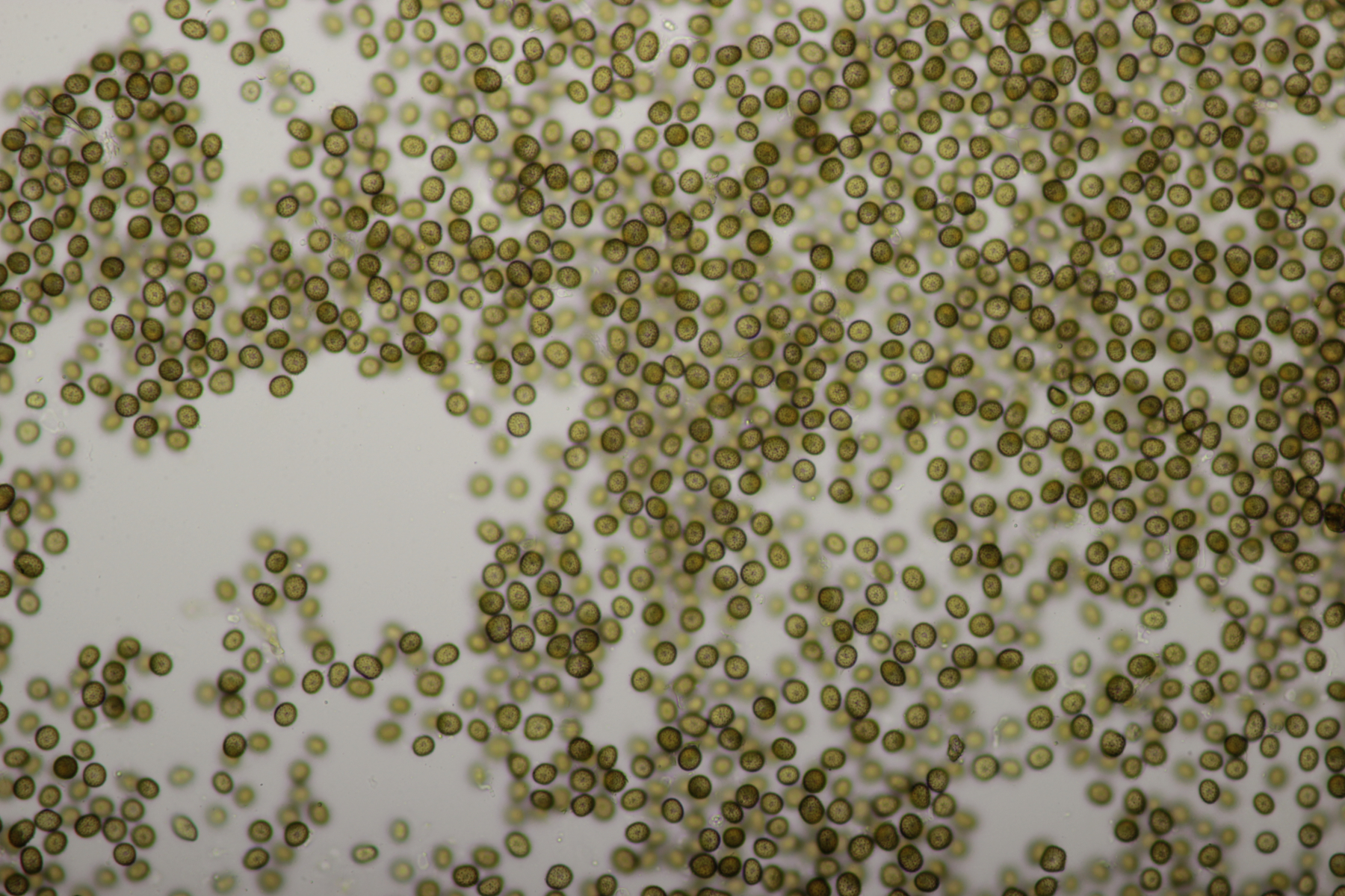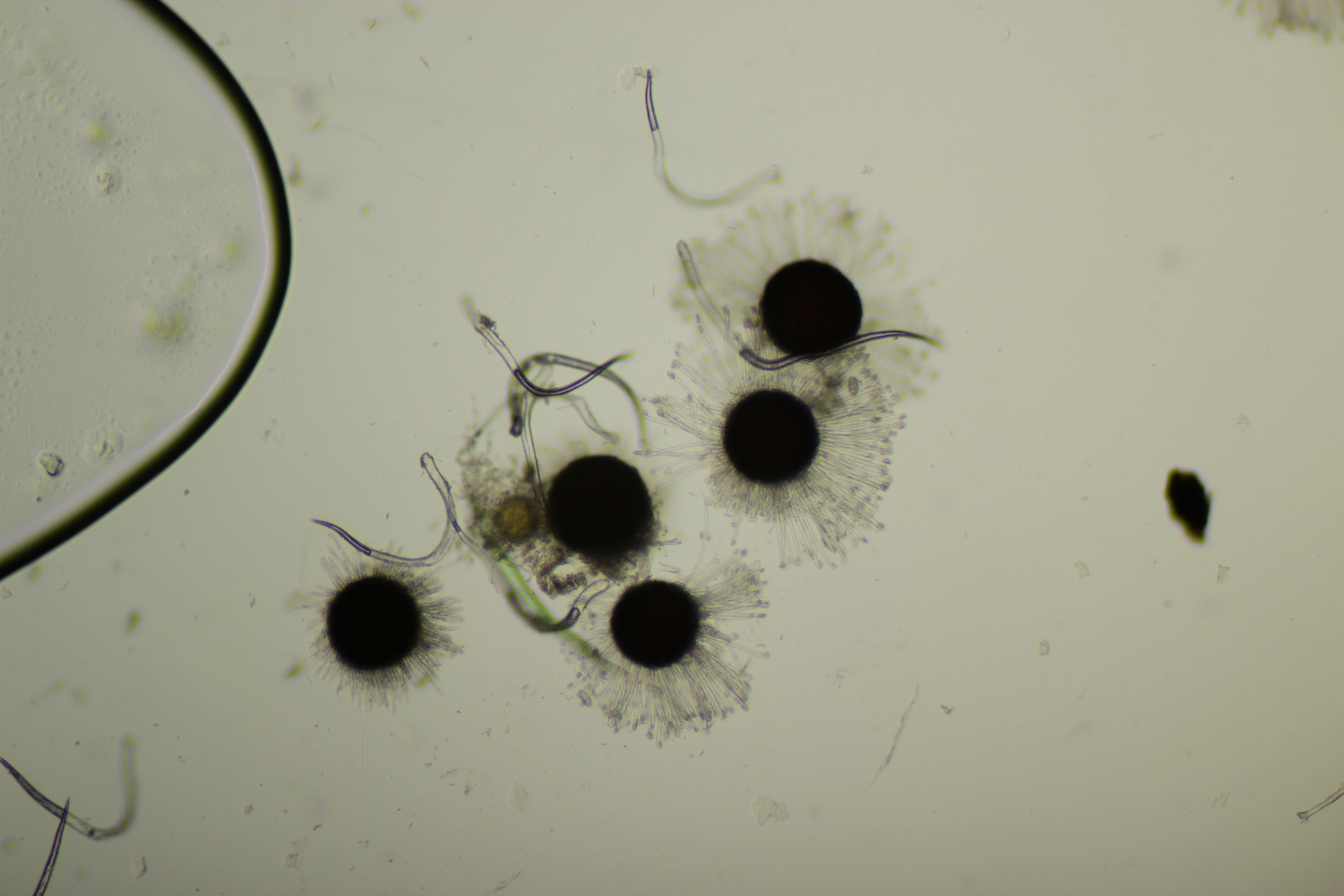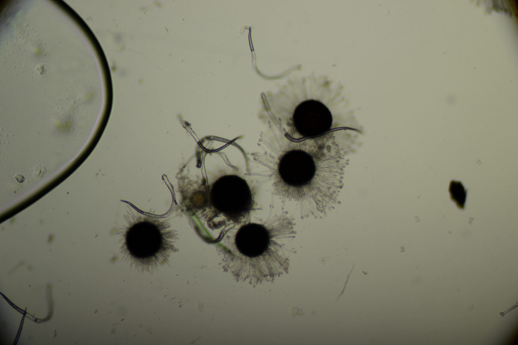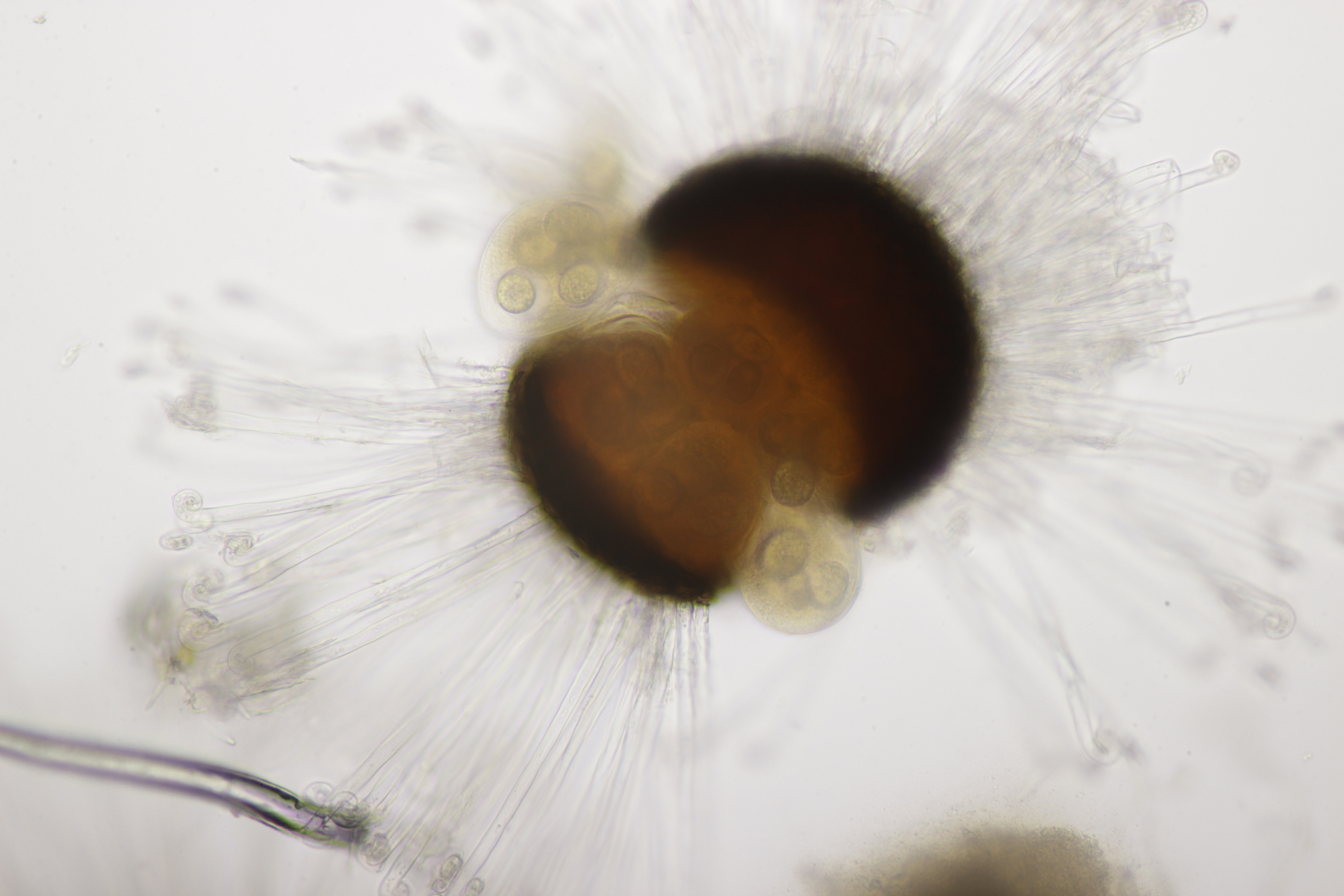 8. Und dann hat meine Mutter mir noch von ihrem Zitronenbaum erzählt, wo die Blätter abtrocknen und es kleine schwarze Beläge gibt. Unterm Mikroskop zeigten sich dann einerseits Alternaria-Sporen, andererseits auch diese Konidien hier. Viellecht hat da ja jemand eine Idee zu?