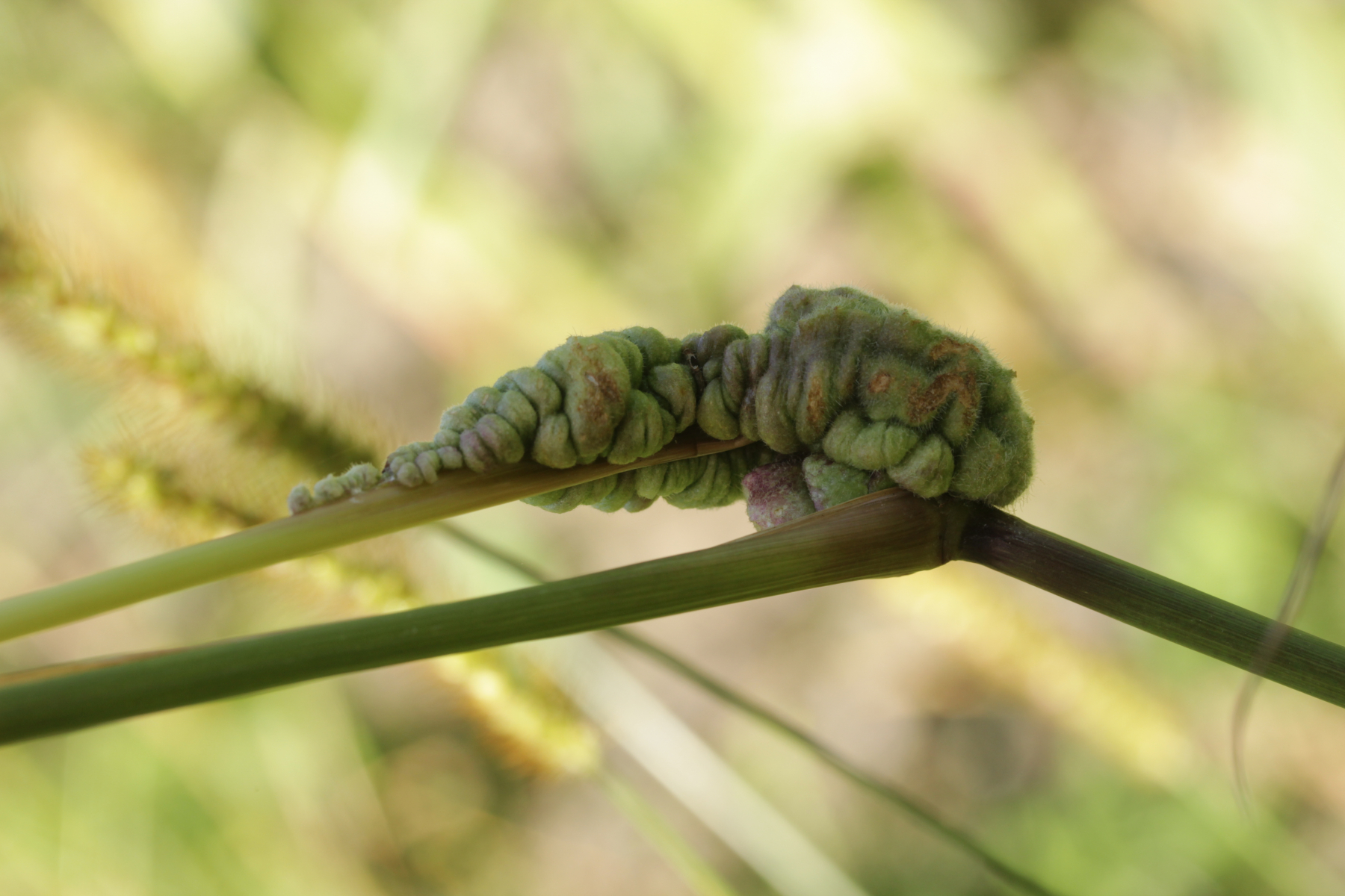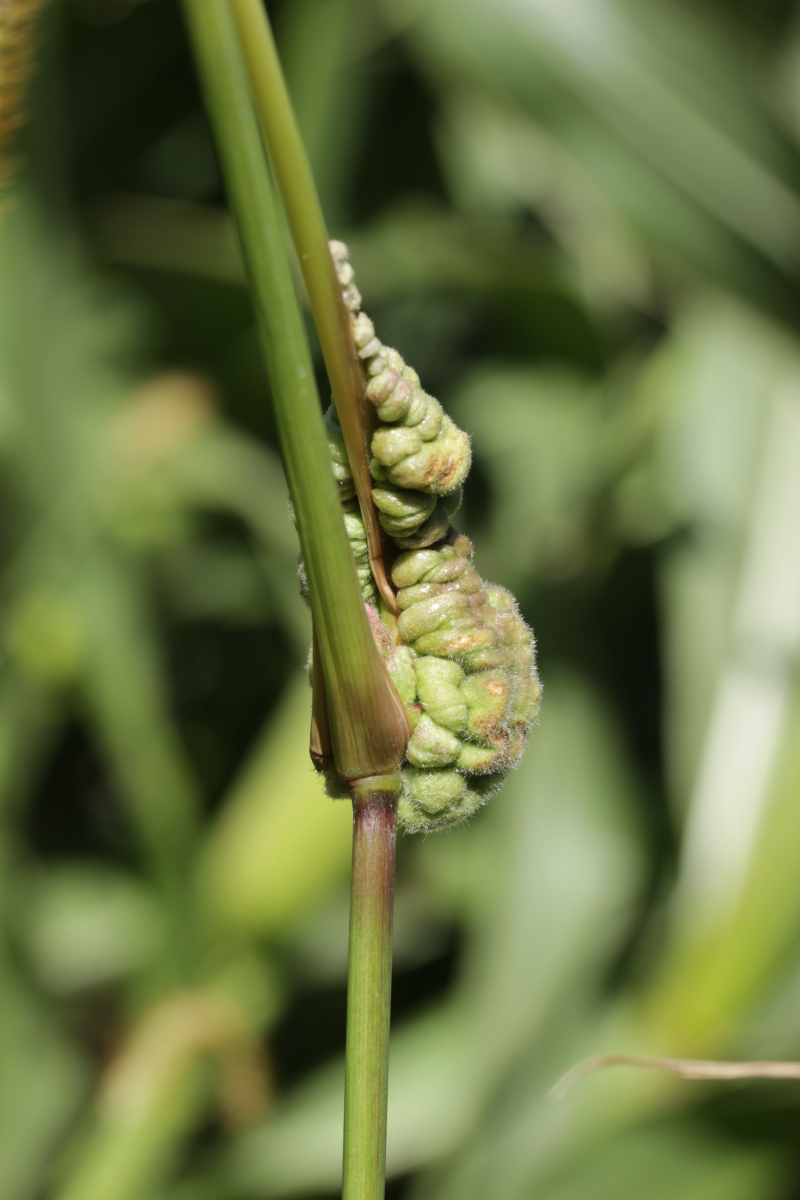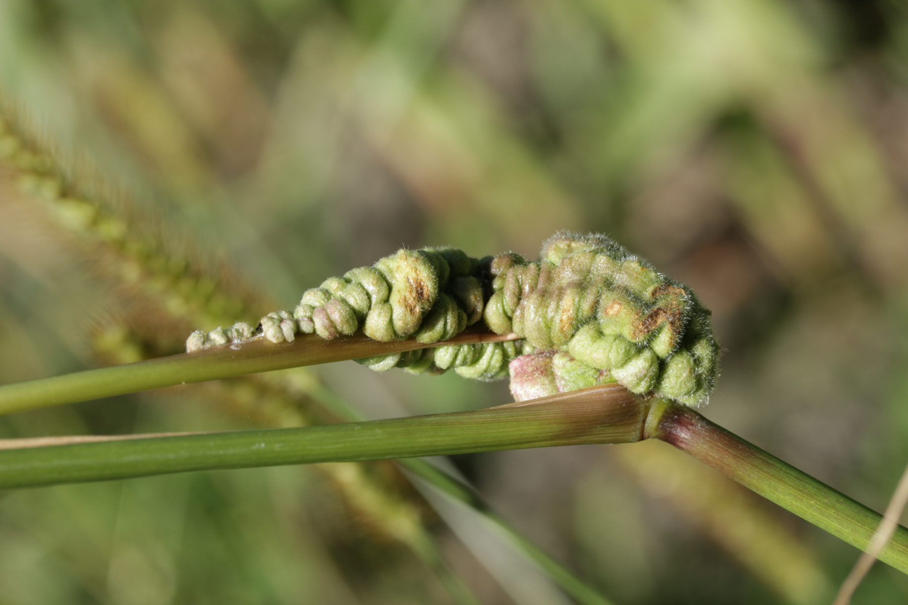 6. Dann war ich bei meinen Eltern, wo gegenüber ein Maisfeld ist. Dank Jules letztem Rundbrief wußte ich, daß die komische Pflanze, die an jedem Maisfeldrand wächst, Hühnerhirse ist und von einem Brandpilz (genauer sogar von 2 verschiedenen Bränden) befallen werden kann. Also sind meine 6-jährige Nichte und ich losgezogen und wurden auch schon bald fündig: Ustilago trichophora ex Echinochloa crus-galli