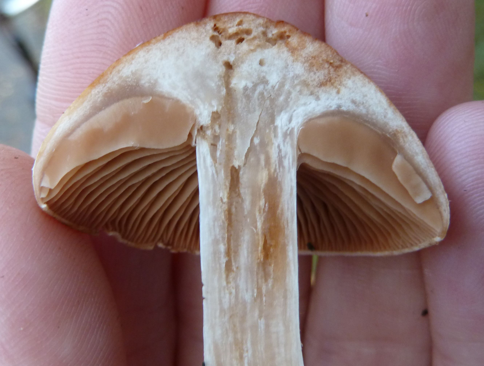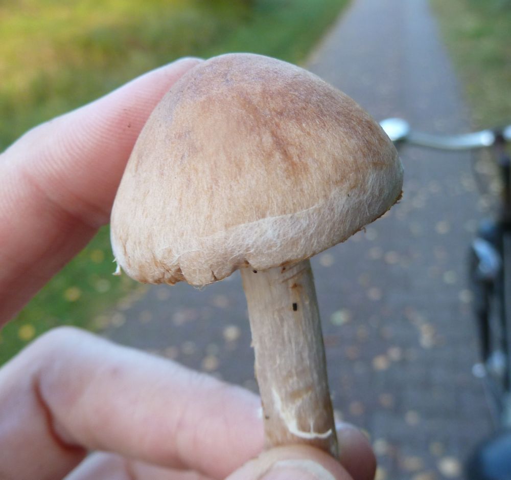 Auffallend fand ich aber ihre Art und Weise, mit einem Trockenschaden aufzubrechen. Fast schon wie Schirmlinge. Sind aber definitiv Champis! Der Ring oben hatte schon Bitterschoko-Lamellen, die hier noch Vollmilch, aber braun waren sie.
