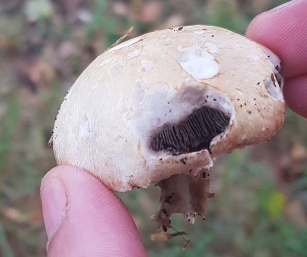 Auffallend fand ich aber ihre Art und Weise, mit einem Trockenschaden aufzubrechen. Fast schon wie Schirmlinge. Sind aber definitiv Champis! Der Ring oben hatte schon Bitterschoko-Lamellen, die hier noch Vollmilch, aber braun waren sie.