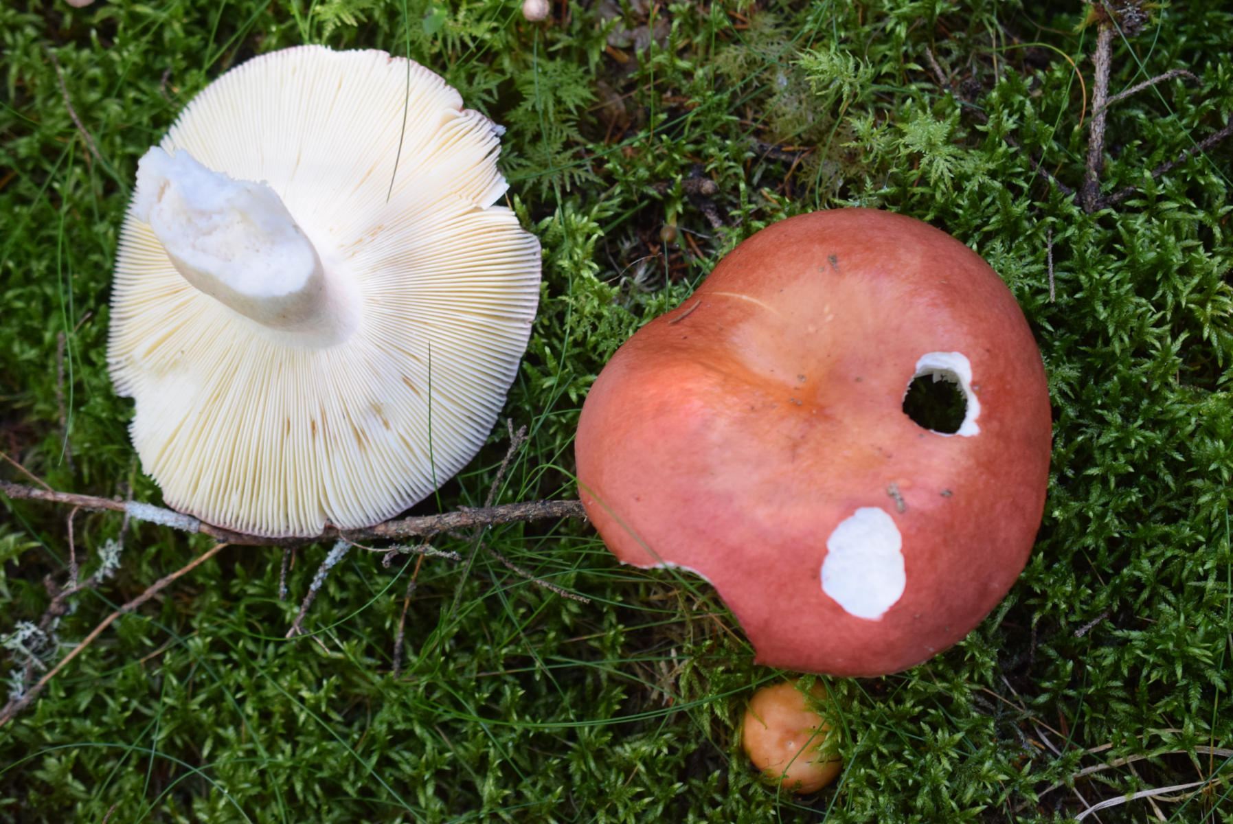 R. olivacea stimmt ganz sicher, R. nauseosa kann gut sein, aber R. laricina wäre auch eine Option (Lärchen gibt es da ja auch, das sieht man auf einem der Fotos), und bei dem unbekannten roten Täubling könnte man R. paludosa (Apfeltäubling) vermuten. Der mehr braun als blaue Cortinarius sieht mir nach C. variicolor-Aggregat aus (Erdigriechender Schleimkopf). Dieser hätte einen sehr auffallenden Rote-Beete-Geruch und würde im Fleisch mit KOH gelb bzw. gelbbräunlich verfärben.