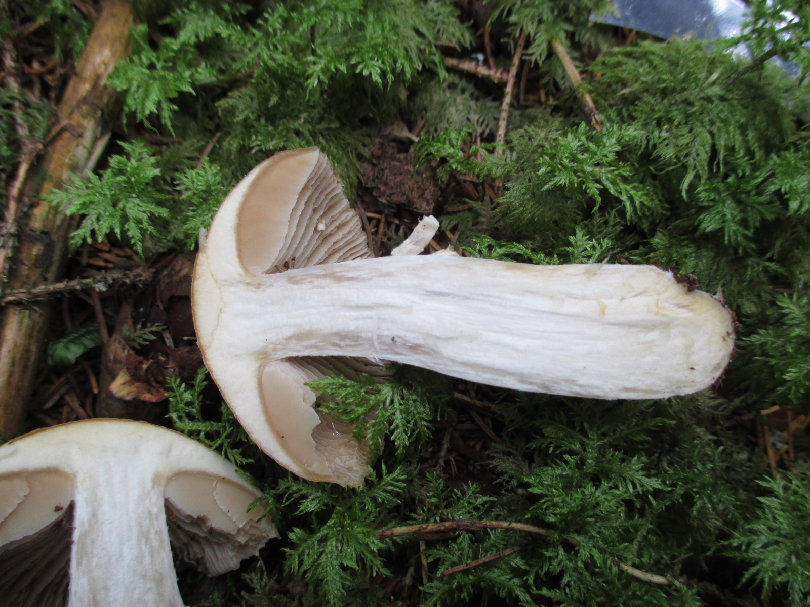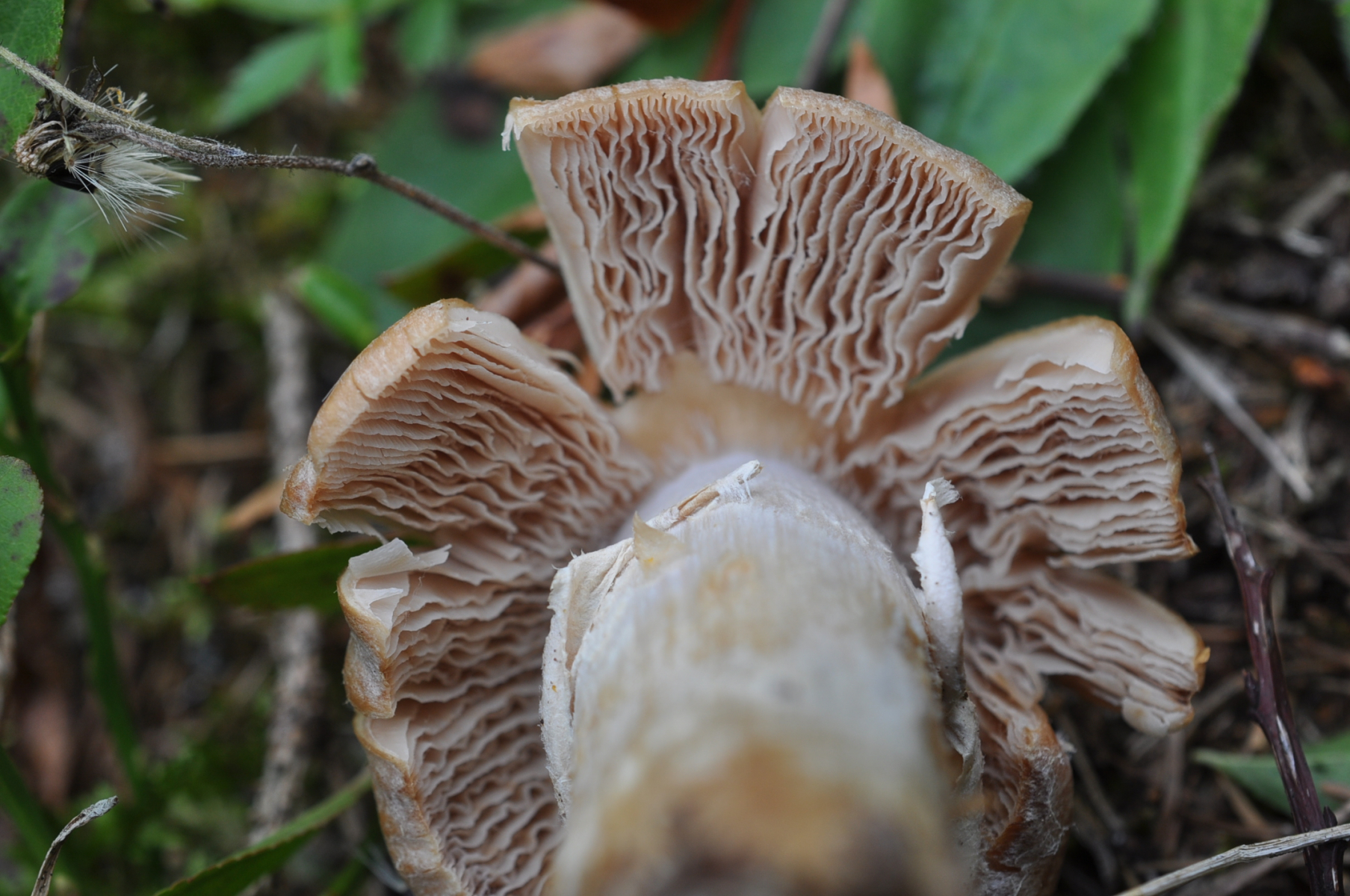 hellbräunlich, hell zimtfarben im Schnitt, am Stiel angewachsen, mit Zwischenlamellen, wellig.