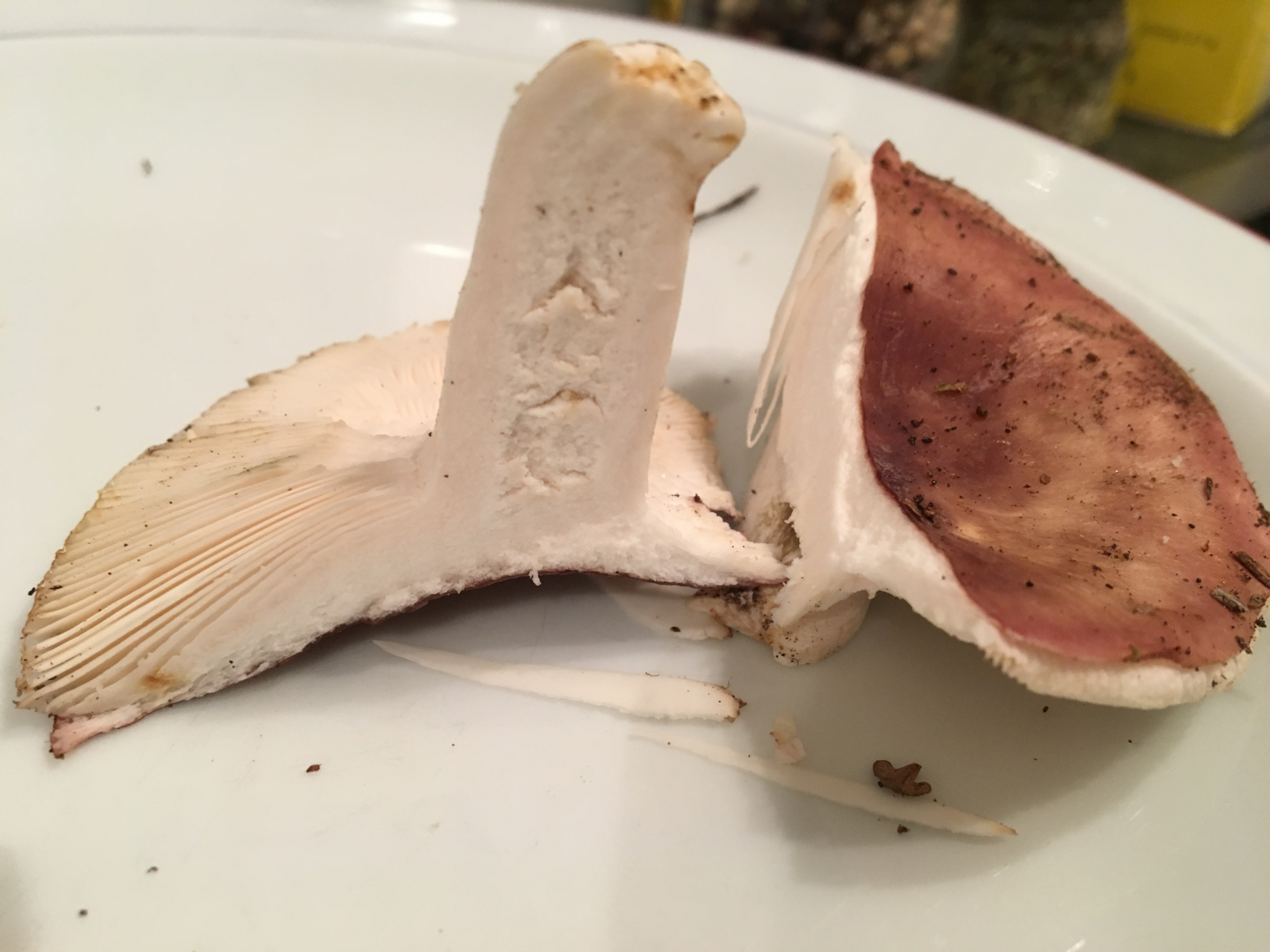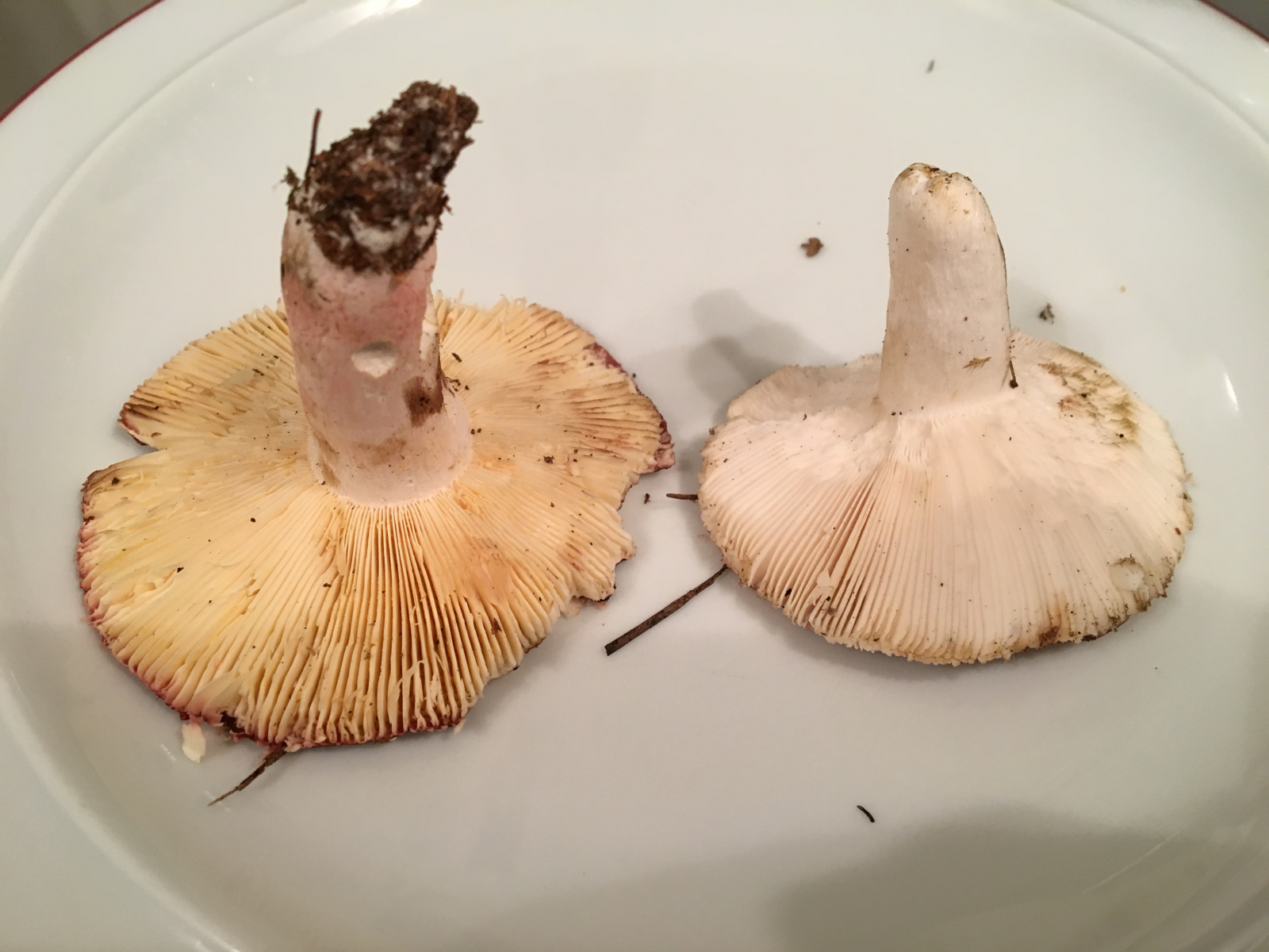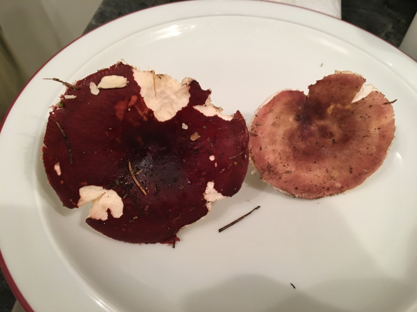 Redest du von dem linken der beiden (dunkelroter Hut)? Da hätte ich als Idee den Zedernholztäubling bzw. Heimtückischen Täubling (Russula badia).