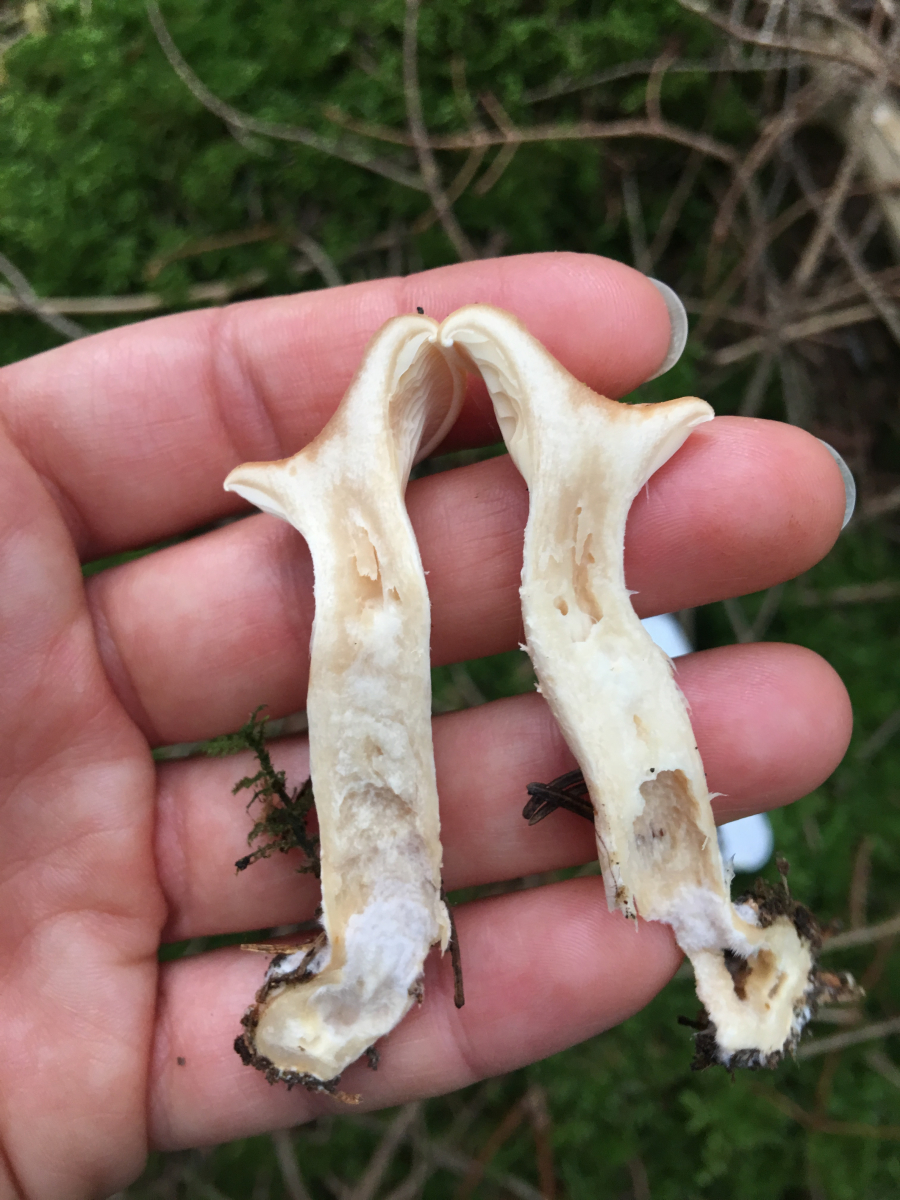Im Fall von Nummer 3: Ist zwar auch ein Mykorrhizapilz, aber nicht in Symbiose mit Algen, sondern mit Bäumen. Wenn spätestens beim Reinknien nach Kohl riechend, ist das Thelephora palmata (Stinkender Warzenpilz). Wenn auch zerknautscht und zerdrückt ganz und gar ohne kohlartigen Geruch, dann vielleicht eher Thelephora anthocephala, angesichts des Bildes (Nadelstreu + Sphagnum - Moose) würde ich aber eher auf einen bodensauren Nadelwald als Habitat schließen. Das wäre nichts für Thelephora anthocephala, die mag basischen Boden und bevorzugt Laubbäume als Mykorrhizapartner.