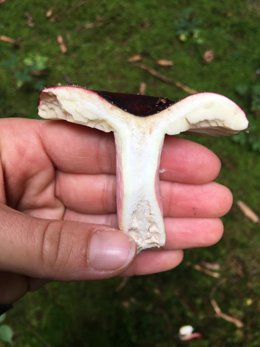 Der rote Hut, die Fichtennadeln drauf, der rötliche Stiel und der an der Basis bräunende Stiel würden ja dazu passen. Vielleicht nennt er uns noch seinen Kandidaten.