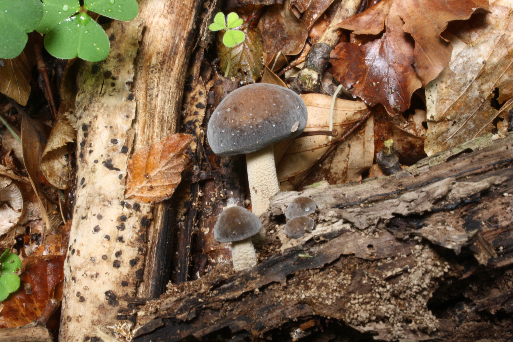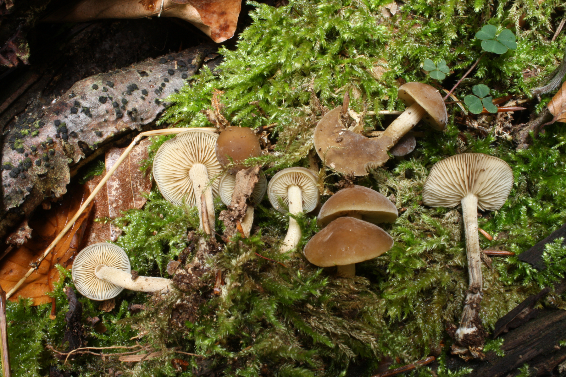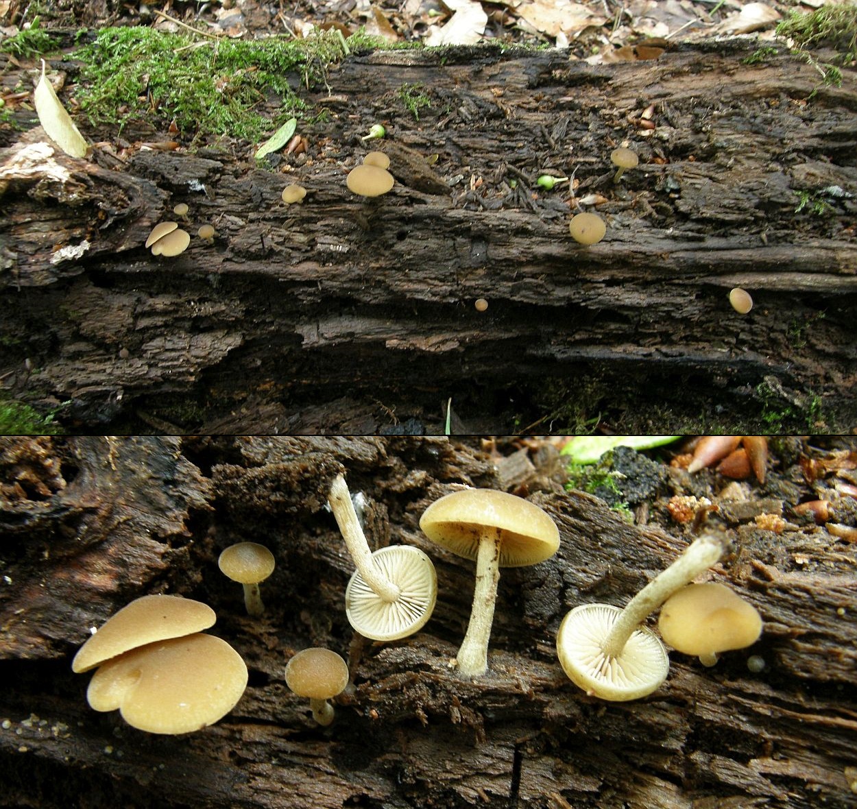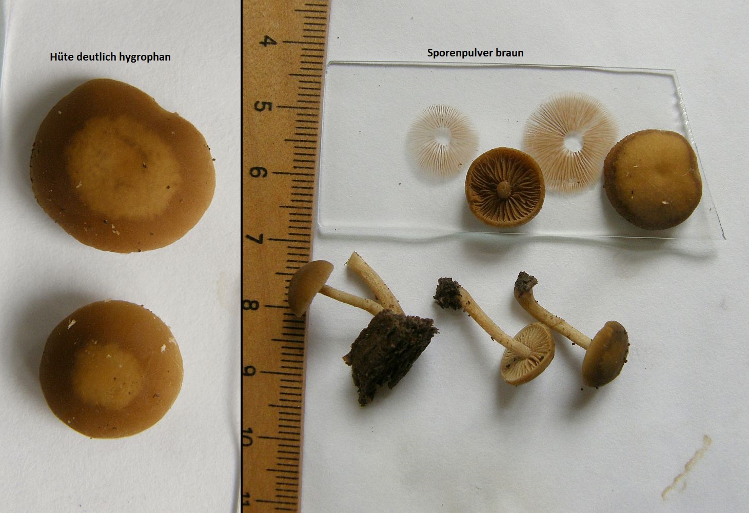 Die dunkleren Pilze auf den ersten Fotos waren auf einem anderen Holzstück, ca. 1 m entfernt, da bin ich mir nicht sicher, ob sie zur reichhaltigeren braunen Kollektion gehören. Falls nicht, wären es zwei unbekannte Hellsporer…. Ich denke, das Holz war Laubholz.