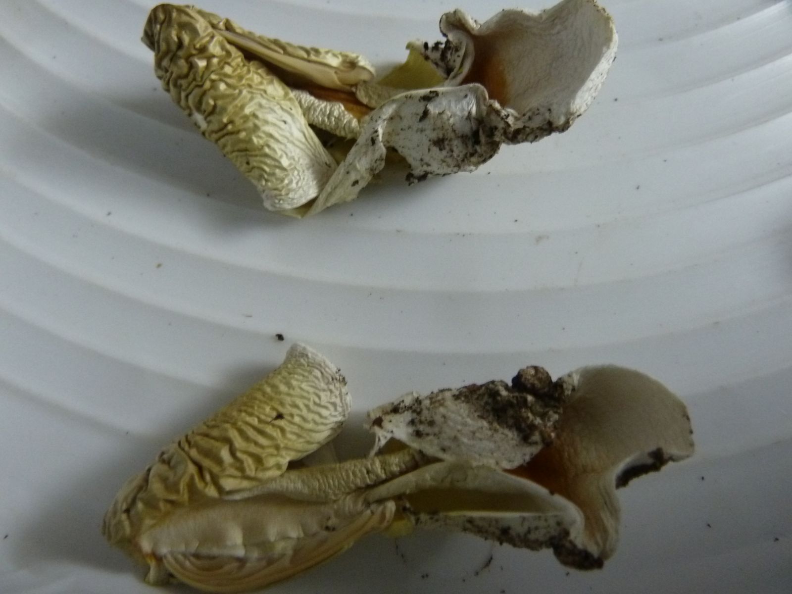 Lediglich der Fruchtkörper links unten im Bild hat einen lädierten Stiel und Knolle, beides hat eine gelartige Konsistenz mit leichtem Ammoniakgeruch und wurde vor dem Trocknen entfernt.