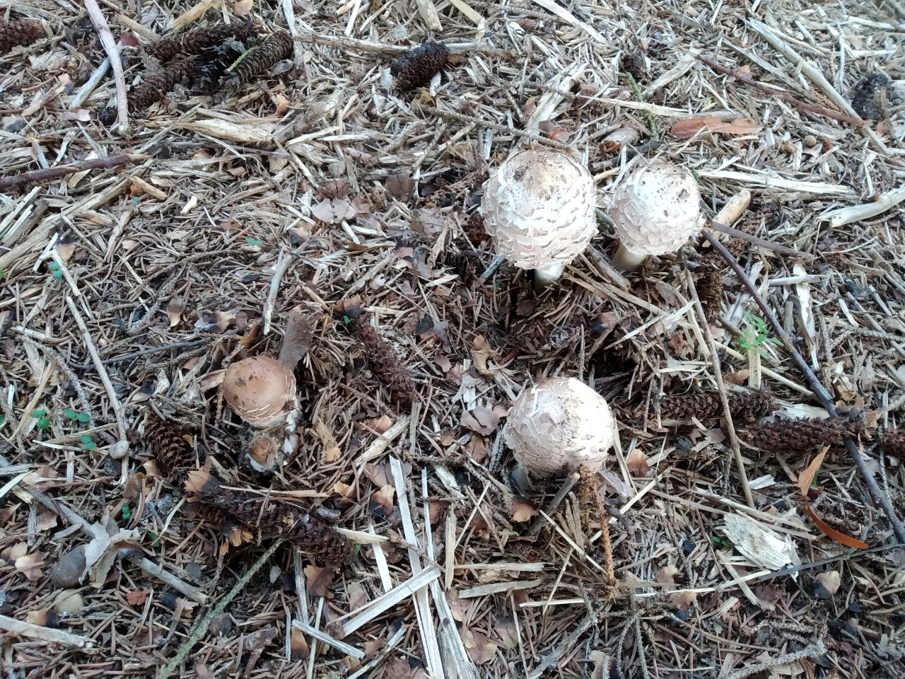 Sie wachsen auf geheckselten Gartenabfällen um eine Fichte herum, andere Nadelbäume sind auch in der Nähe.