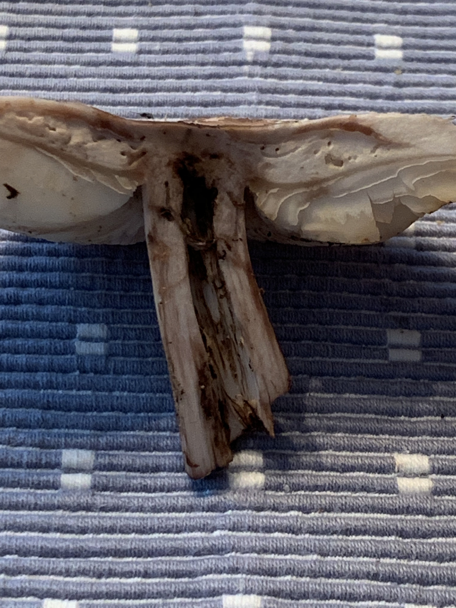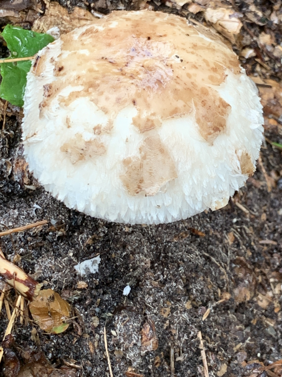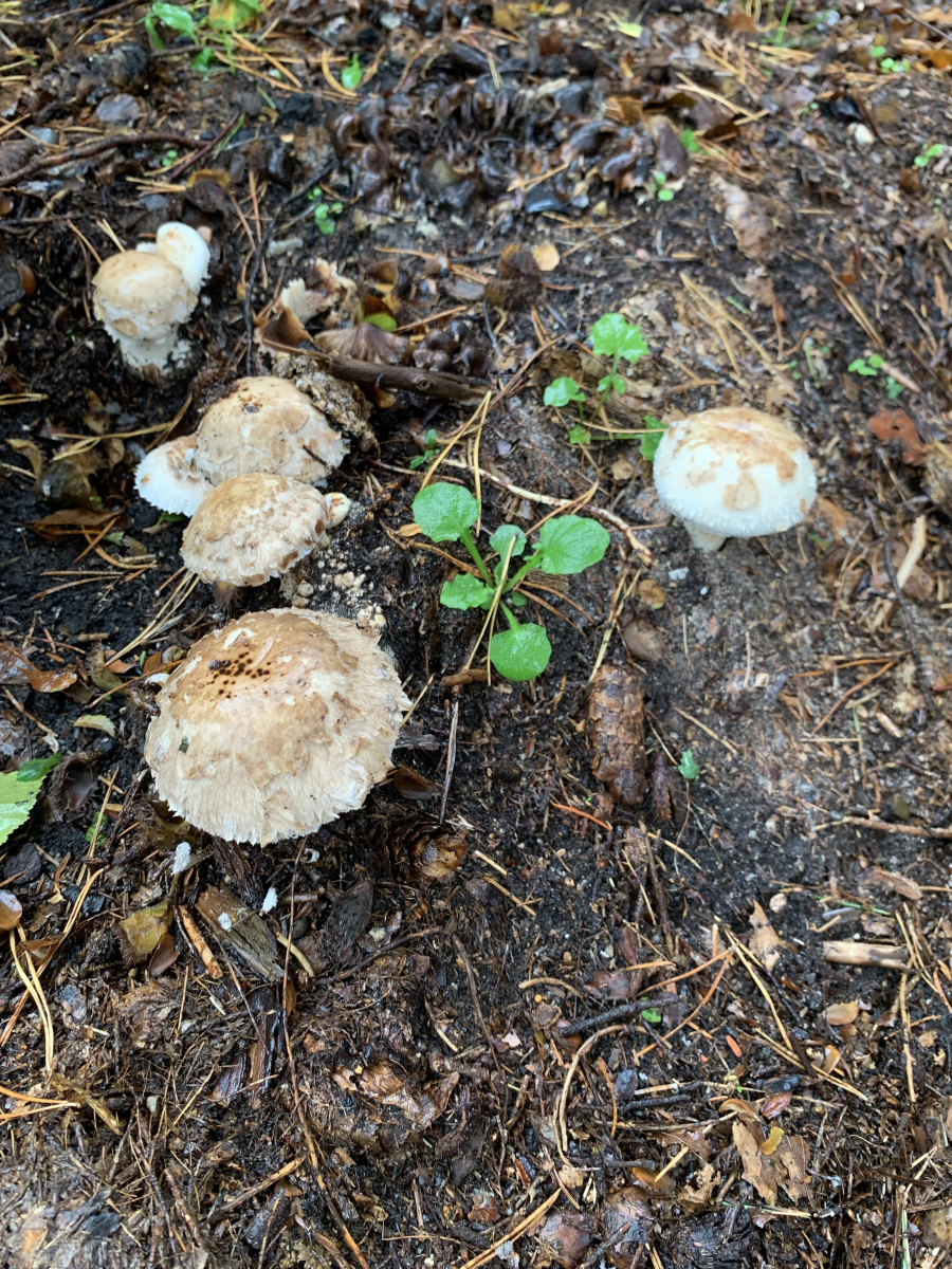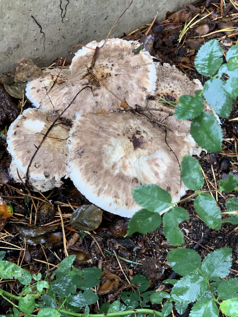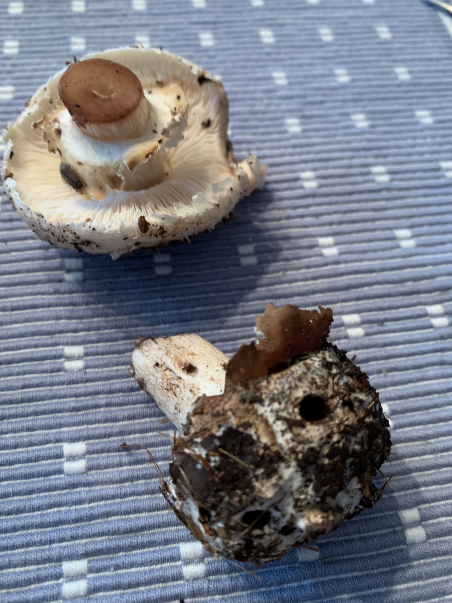 • Seit ein paar Tagen wachsen hier bei uns viele dieser Pilzart. Bäume bei uns sind Fichten, Kiefern und eine Buche aber vor allem der Gartenabfallhaufen von genau diesen Bäumen. Ich habe jetzt alle verfügbaren Bücher gewälzt, aber nichts Passendes gefunden. Die Bilder zeigen einen älteren und einen jüngeren Pilz. Hut ist mittig braun und nach außen hin leicht schuppig. Lamellen weiß, dicht gedrängt und zum Stiel hin absolut frei stehend. Schnitt verfärbt sich leicht mittelbräunlich. Alles wächst aus einer kugeligen Knolle raus. Geruch angenehm nach Erde.