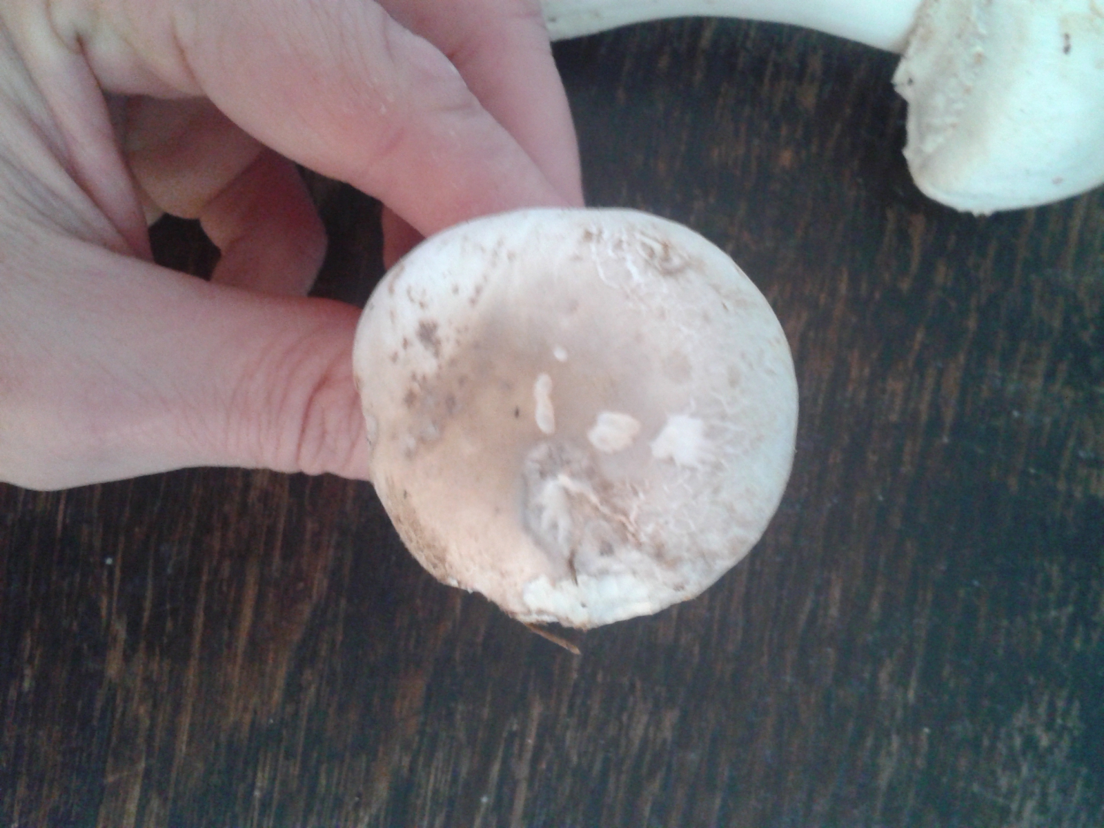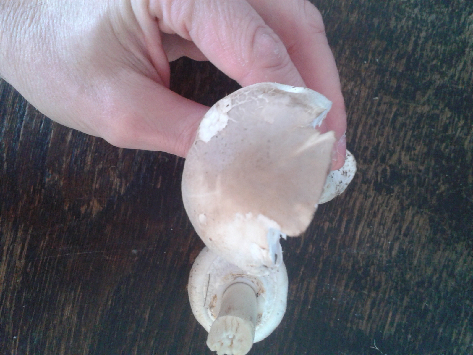 1.) Lamellen: Die Lamellen der gefundenen Pilze waren weiß und hätten rosa bzw. später/älter schokoladenbraun sein müssen.