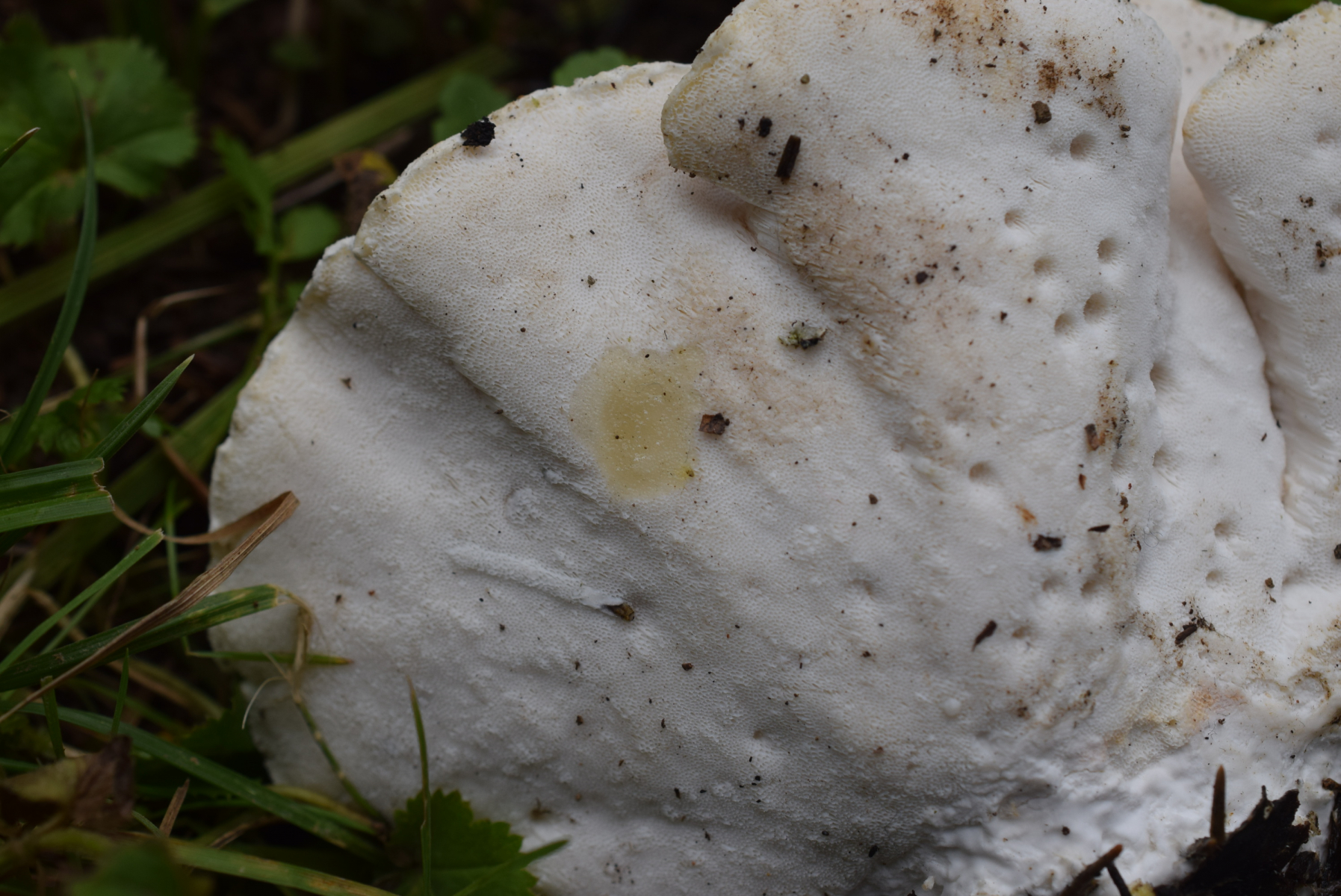 Der weiße Porling (zu kleine Poren für Climacocystis, und Oberfläche nicht haarig genug) könnte Oligoporus guttulatus sein. Der ist nicht immer deutlich bitter (im Gegensatz zu Oligoporus stipticus) und auch nicht immer deutlich tropfig.