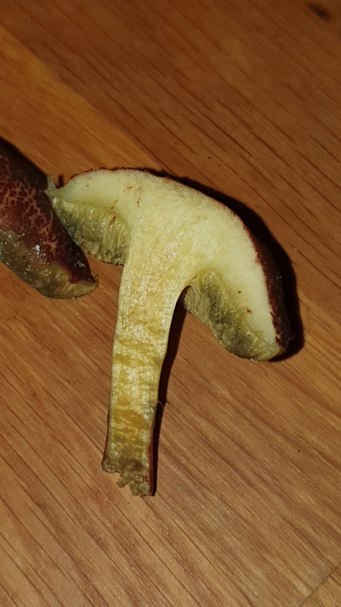Ich dachte der würde (viel stärker) blauen, insbesondere am Stiel nach dem Entnehmen. Und auch an den Poren nach Druck und an der Stielbasis (die beim Schnittbild leider fehlt). Und es ist ja immerhin ein junger vitaler Fruchtkörper, bei dem die Blaufärbung noch recht schnell gehen müsste.