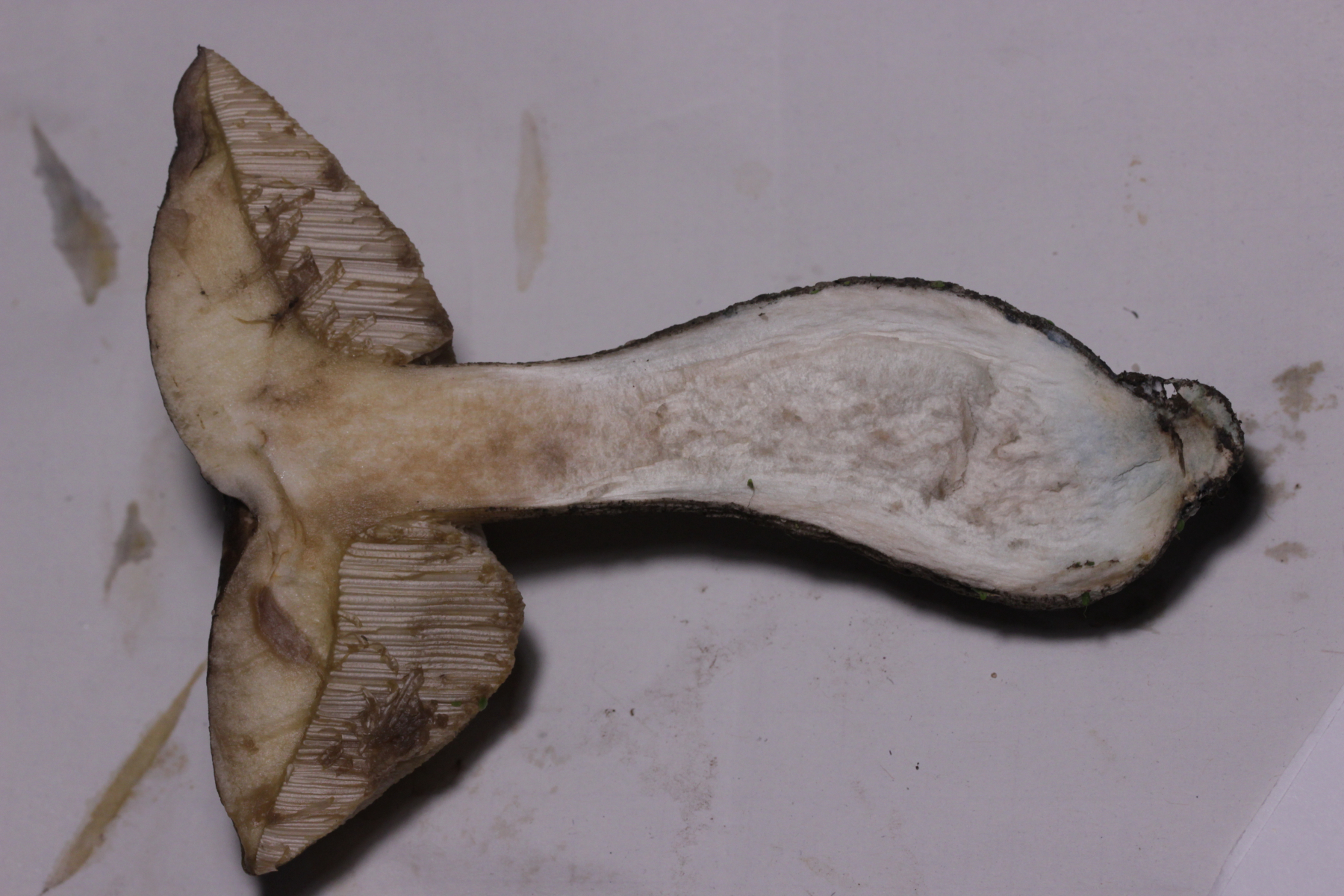 gestern bin ich auf dem Heimweg durch den Duisburger Stadtwald gegangen um zu schauen, was der Regen dort so alles angerichtet hat. Insgesamt alles sehr erfreulich: Die Pilze beginnen zu wachsen. Unter anderem fand ich folgenden Leccinum, der in direkter Nähe zu einem Teich wuchs (und deshalb auch voll mit so kleinen grünen Pflänzchen war). Zunächst deutete alles auf Leccinum scabrum hin. Beim Durchschneiden zeigte sich rein weißes Fleisch ohne Verfärbungen. Nach einer halben Stunde wurde dann die obere Hälfte des Pilzes braun. Nach circa 2 Stunden zeigte sich dann eine Bläung im unteren Stielteil. Heute morgen war der Pilz dann zweigeteilt mit braunem Fleisch in der oberen und bläulichem Fleisch in der unteren Hälfte.