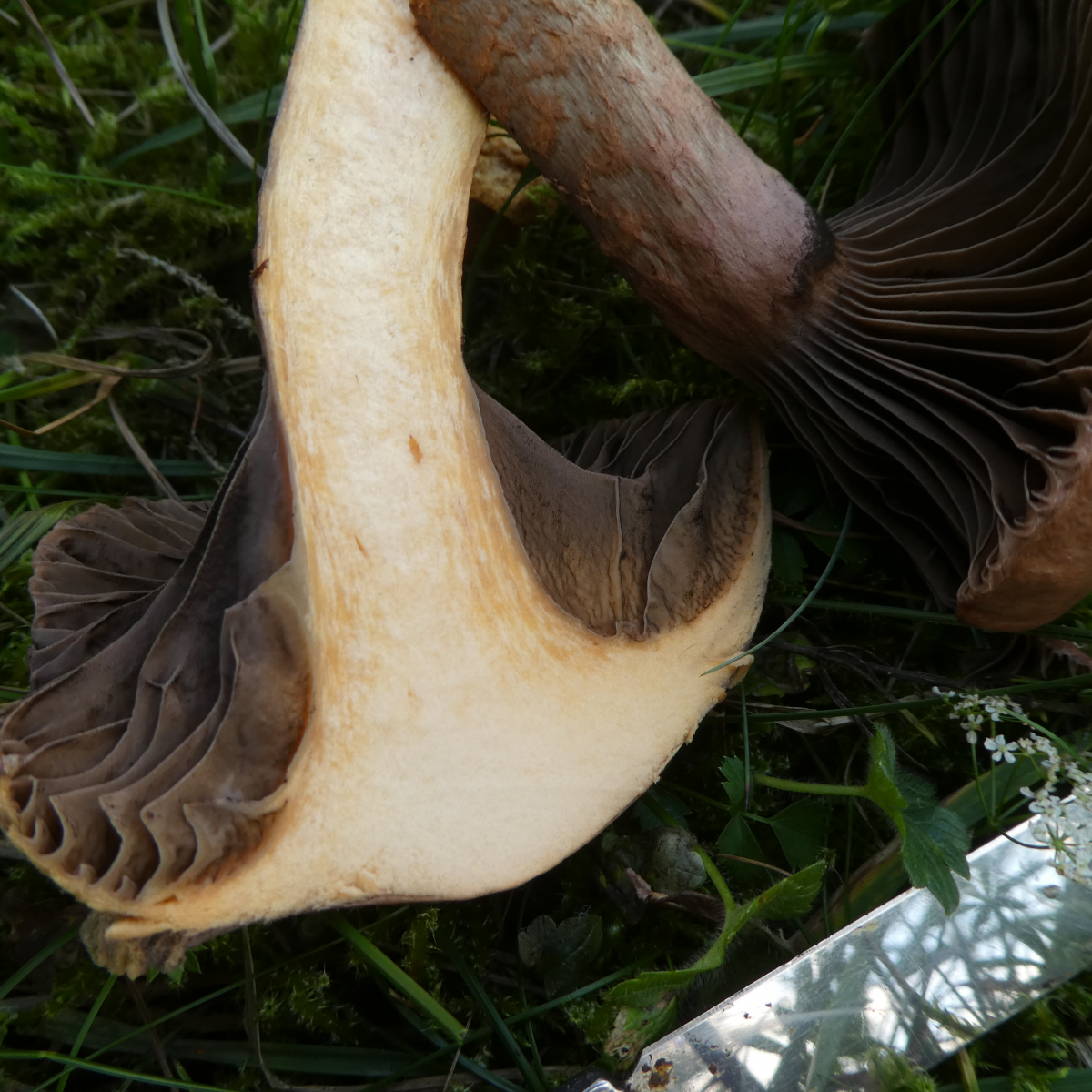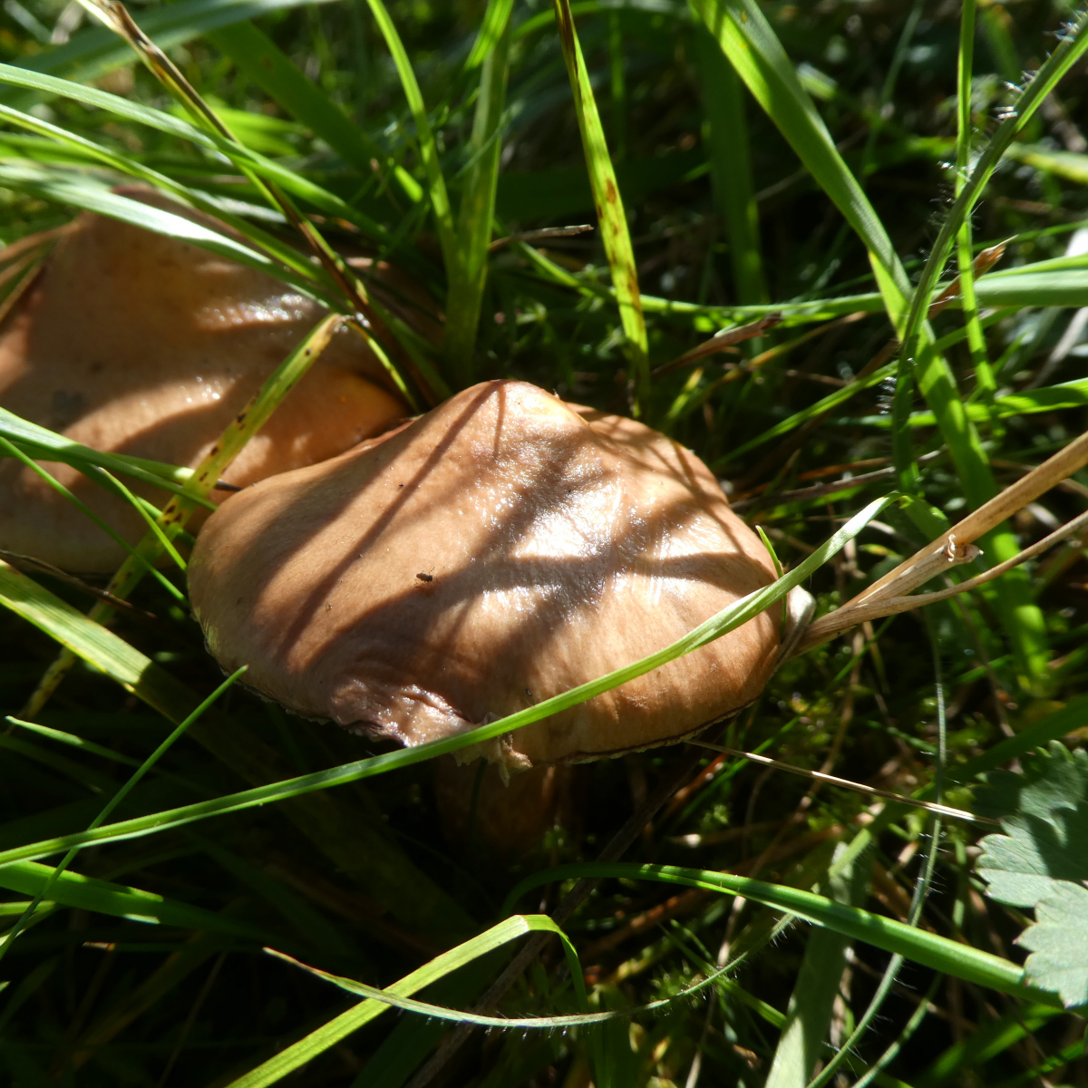 Pilz 1 fotografierte ich am 14.09.2019 im Altmühltal auf einem schmalen Pfad der einen Trockenrasenhang von einer Halbtrockenrasenwiese abgrenzt. In der Nähe standen Laubbäume (verschiedene Arten) und Nadelbäume, ich glaube Tannen oder etwas in diese Richtung, an eine Kiefer kann ich mich allerdings nicht erinnern, wäre aber denkbar. Mir fiel auf, dass der Hut keinen Buckel hatte und filzig finde ich ihn jetzt auch nicht aber auch nicht glatt. Ferner fand ich die Stiele recht ausgeprägt habe aber keine Ahnung, ob dies normal ist. An einen evtl. Geruch kann ich mich nicht mehr erinnern, allerdings ist mir leider der Stiel abgebrochen.