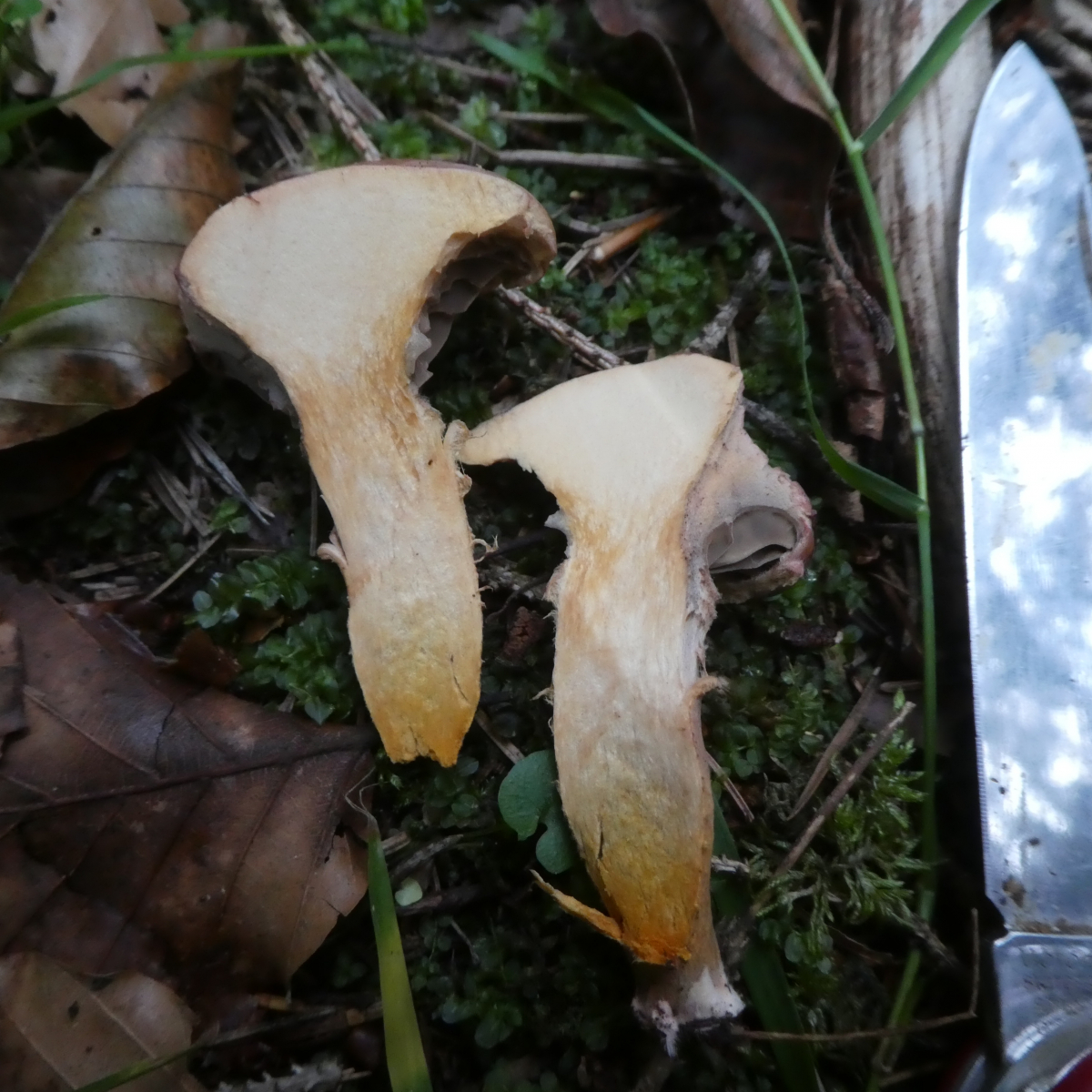 Pilz 3 fotografierte ich bereits ca. am 09.09.2019 in einem gänzlich anderem Habitat - mitten in einem Mischwald, dort neben Laubbäumen auch viele Fichten und etliche Kiefern. Hier bin ich mir auch nicht sicher, ob es sich um den Kupferroten Gelbfuss handelt oder vielleicht eher um den Filzigen zumal die Lamellen ja nicht gerade herablaufen .. wobei, filzig ist der Hut ja nicht gerade.