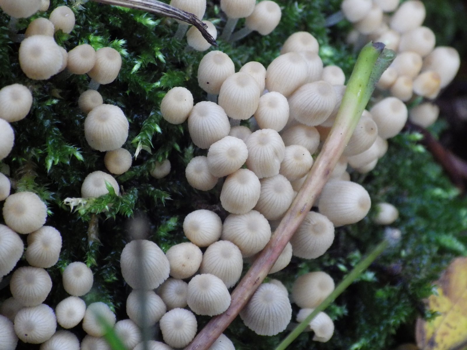 Mycena pseudocorticola passt! Den hatte ich heute auch gefunden. In der Nähe (oder besser am Rand der Gruppe) wuchsen auch noch ein paar fast identischer Pilzchen - nur in braun. Das dürfte dann Mycena meliigena sein. Angeblich wachsen die oft nebeneinander. Hallo Kogge, Du kannst ja noch mal nachschauen.