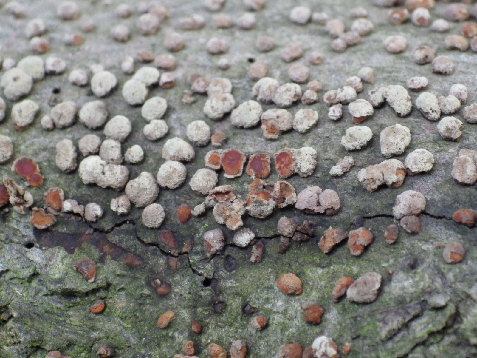 Die "sehr kleinen roten 'Knöllchen'" sind übrigens Nectria coccinea. Der Baum dürfte Buche sein. Zumindest sieht die Rinde so aus... Scharlachrotes Pustelpilzchen = NEONECTRIA COCCINEA (SYN. NECTRIA COCCINEA, CHITINONECTRIA COCCINEA, NECTRIA COCCINEA VAR. LONGICONIA, NECTRIA COCCINEA VAR. SANGUINELLA)