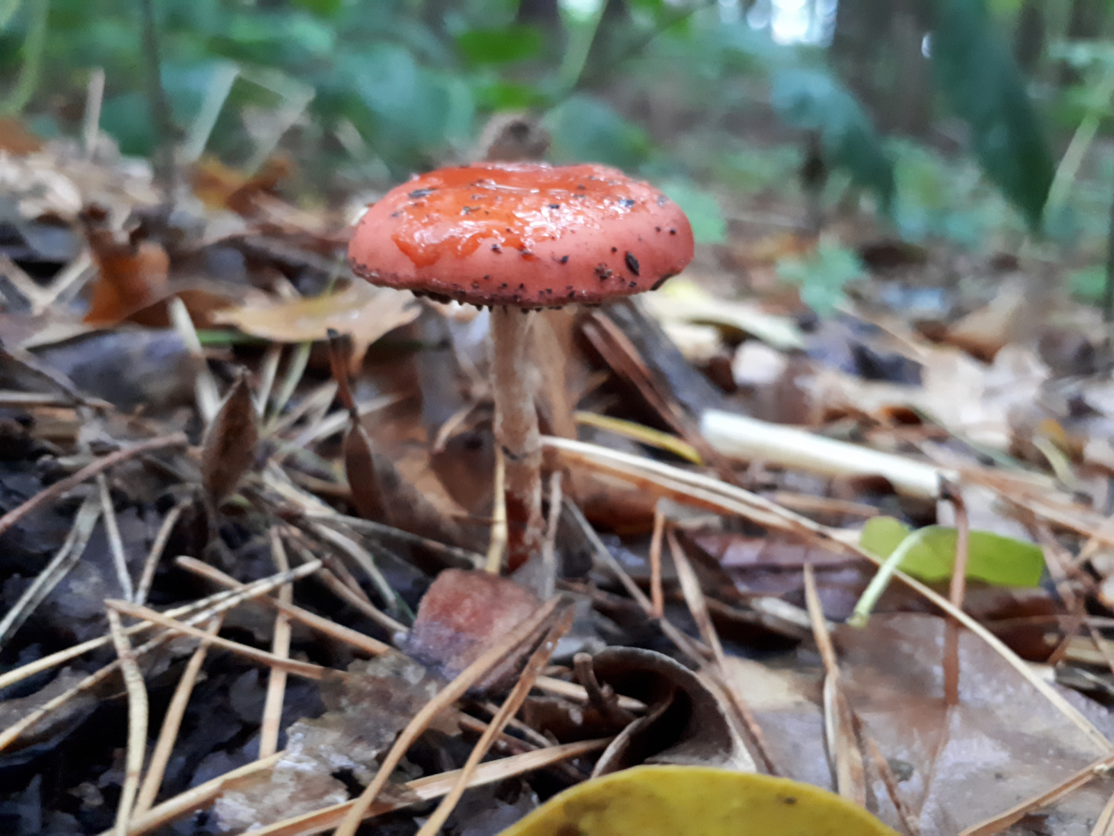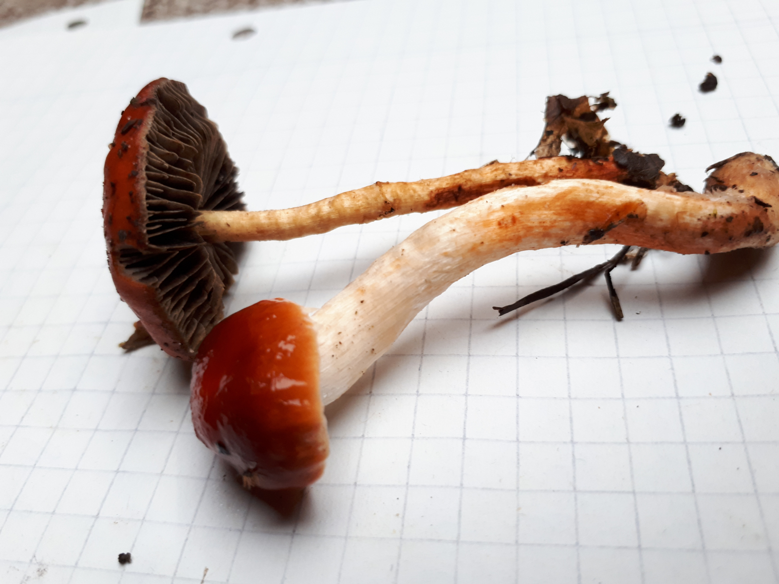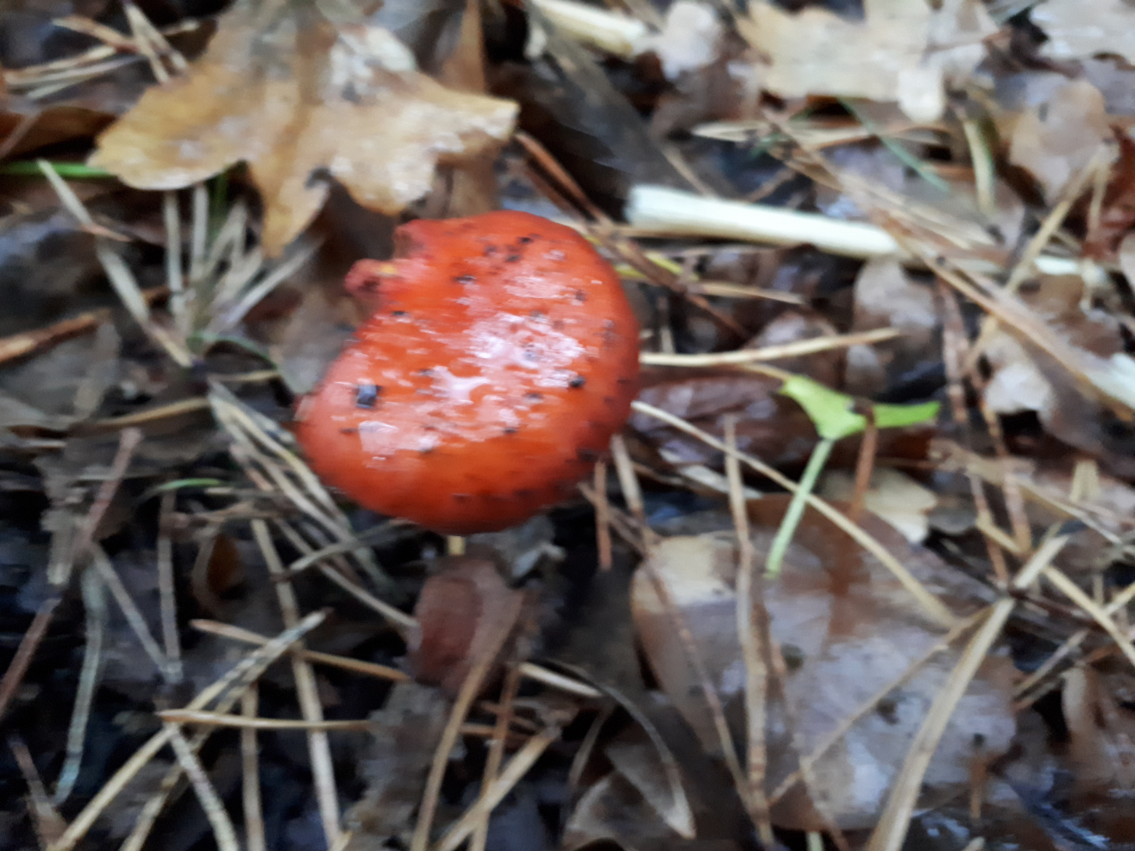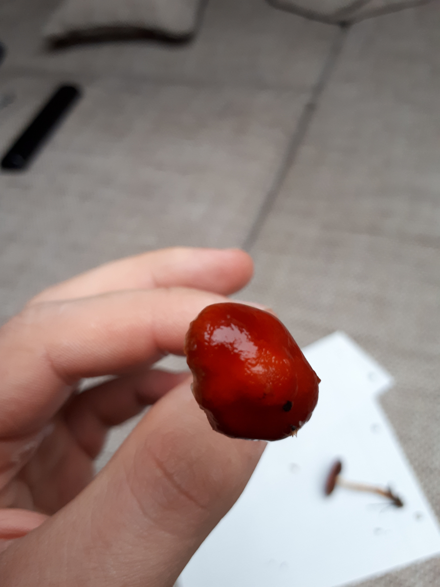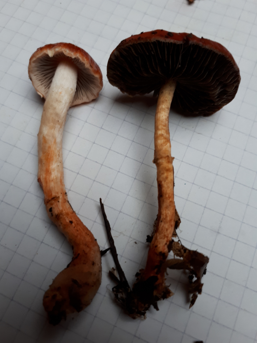 Nr. 1 wurde am Rand eines kleinen Waldstücks gefunden. Es gab noch ein weiteres Exemplar, das auf dem Hut am Rand noch ein paar weiße Flocken hatte, aber der ist mir leider abhanden gekommen. Aufgrund des allgemeinen Habitus, der intensiv roten Farbe und den gräulichen Lamellen komme ich hier auf den Orangeroten Träuschling (Stropharia aurantiaca). Falls es der ist, ist der immer noch so selten, wie er an diversen Stellen beschrieben wird oder hat der sich mittlerweile schon gut ausgebreitet?