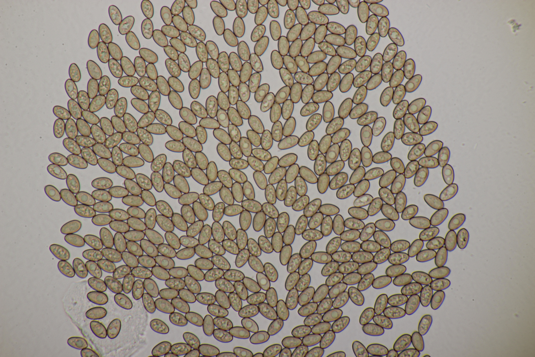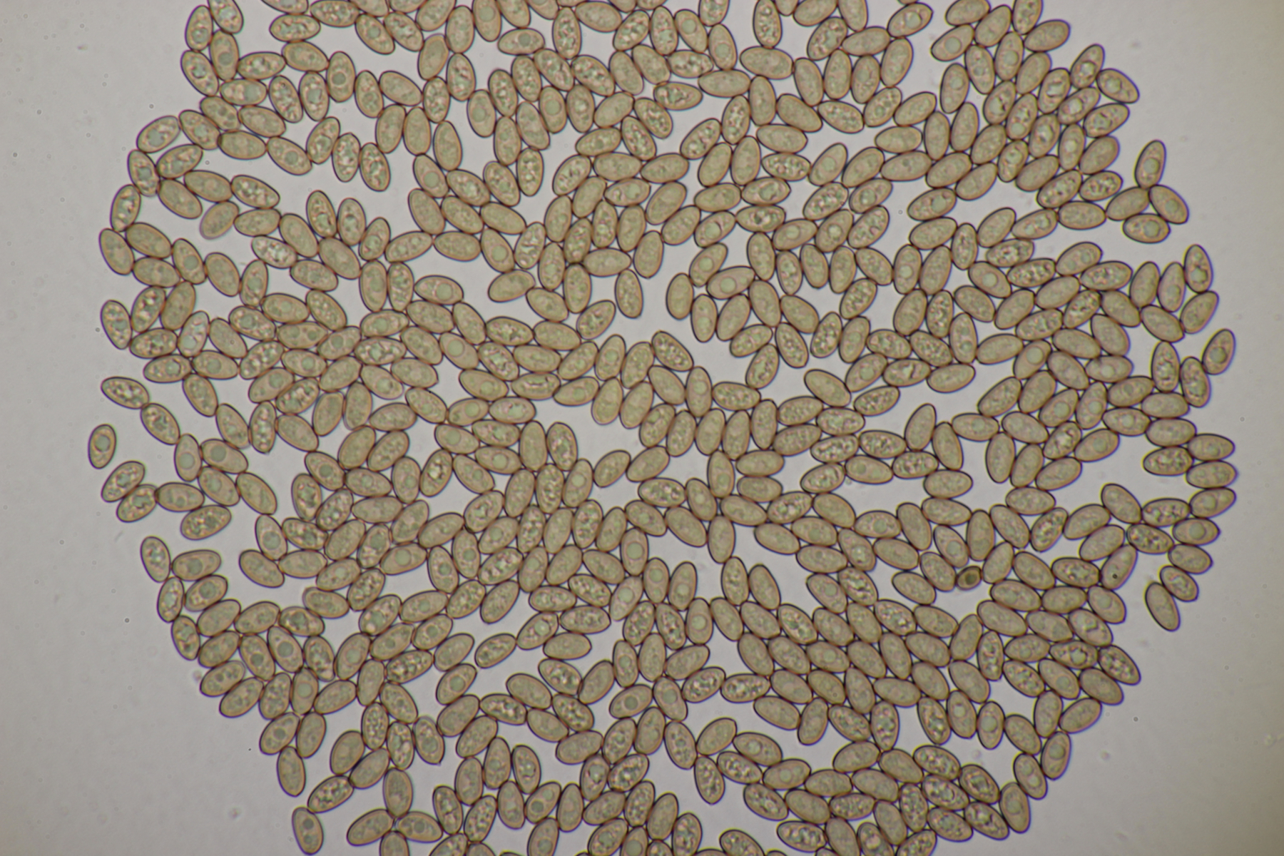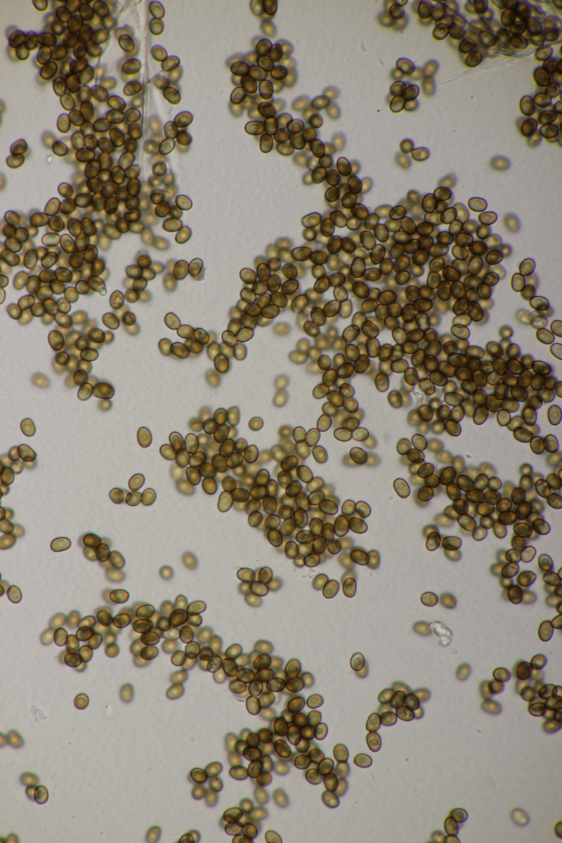 13. Stropharia caerulea. Sporengröße (8.6+-0.4) µm x (4.6+-0.2) µm, Q=1.9+-0.1