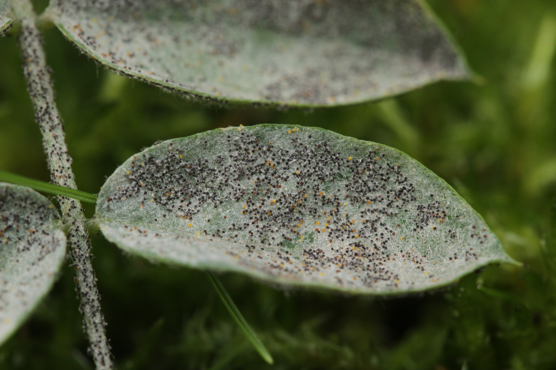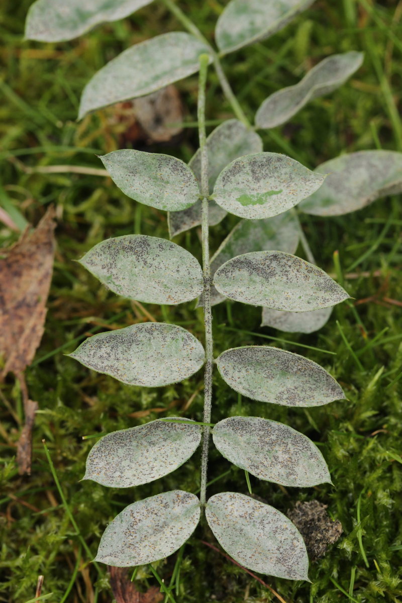 9. Mehltau auf Weide. Vom Blatt her nicht Salix caprea, womit der Mehltau Erysiphe adunca sein müßte. Dafür sind die Anhängsel aber recht kurz und sie standen auch deutlich in eine Richtung ab statt äquatorial.