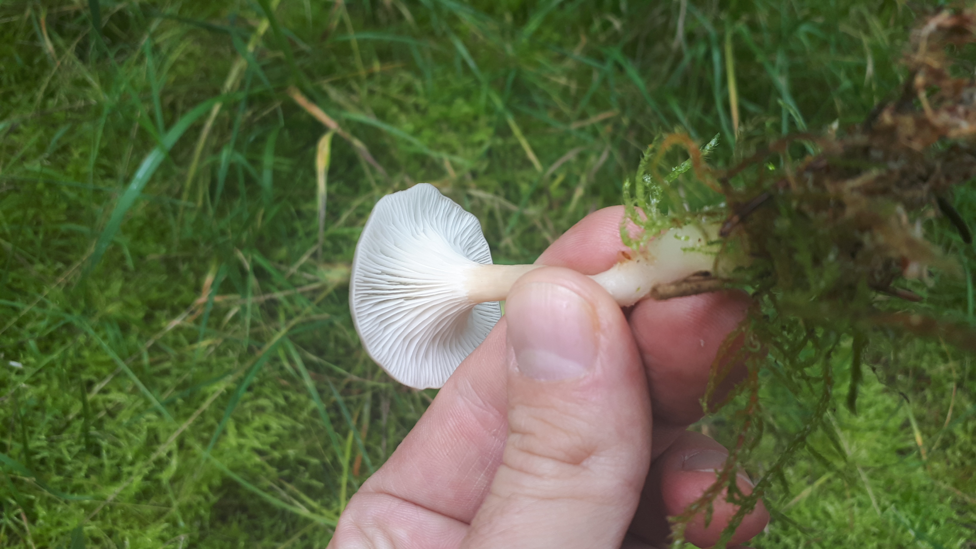 Das eine sind fuchsige Röteltrichterlinge,aber das andere? (Denk ich)Creme-grau farbener Hut, weiße Sporen... Fichtenwaldmoos... kein besonderer Geruch...