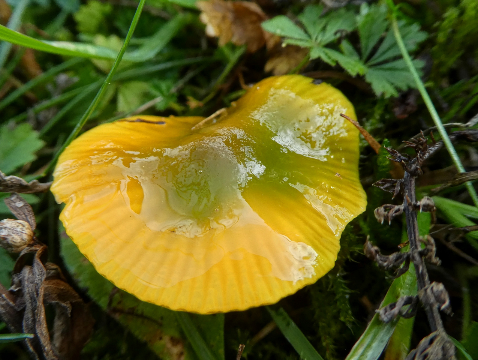 Oder diese hier - die sahen aus wie die Gelbrandigen Saftlinge. Wahrscheinlich Hygrocybe insipida