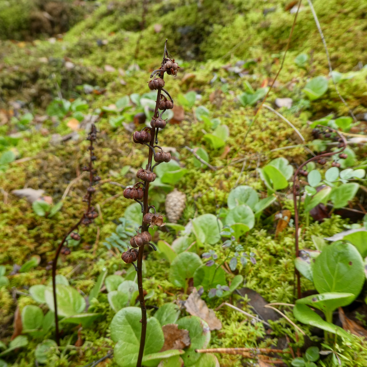 Ich blieb wie angewurzelt stehen, als ich direkt neben dem Weg einen ganzen Hang voll mit Rundblättrigem Wintergrün (Pyrola rotundifolia) sah - dies war wirklich beeindruckend - so flächendeckend über einen ganzen Hang verteilt hatte ich das noch nie gesehen! Und auch wenn wohl kaum jemand nachvollziehen kann warum man sich über verdorrte Blütenstängel freuen kann - ich tue es halt. :)