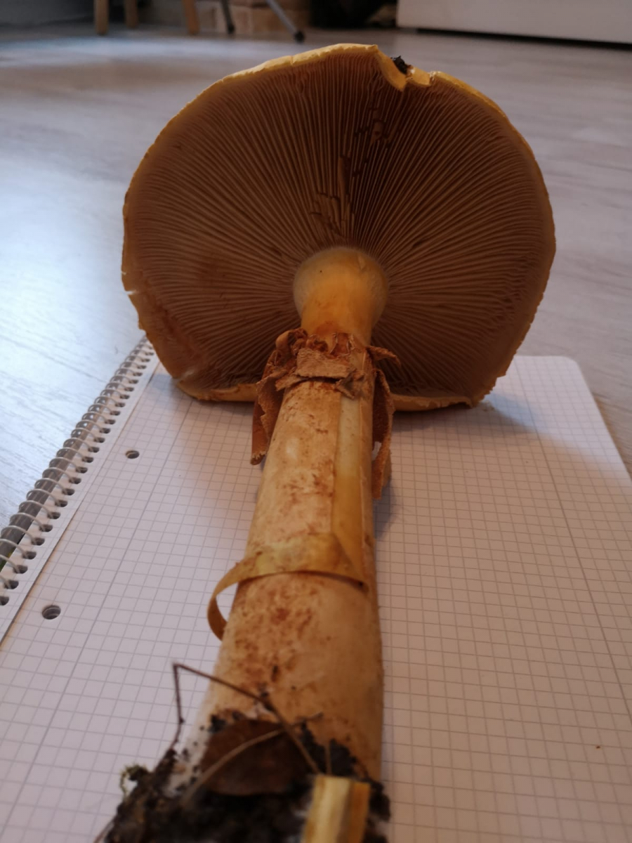 15- 20 cm Deckel, Größe wie Parasol Pilz, dicker Stamm ca. 2-3 cm. Riecht angenehm nussig ähnlich wie das Stockschwämmchen. Färbt leicht ab wenn man ihn anfasst.