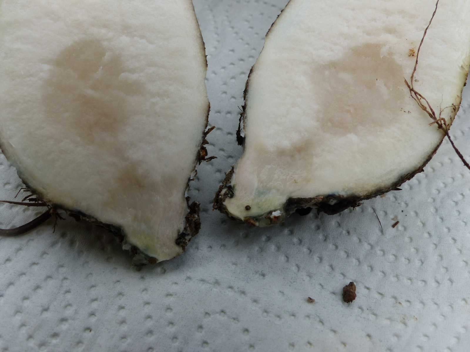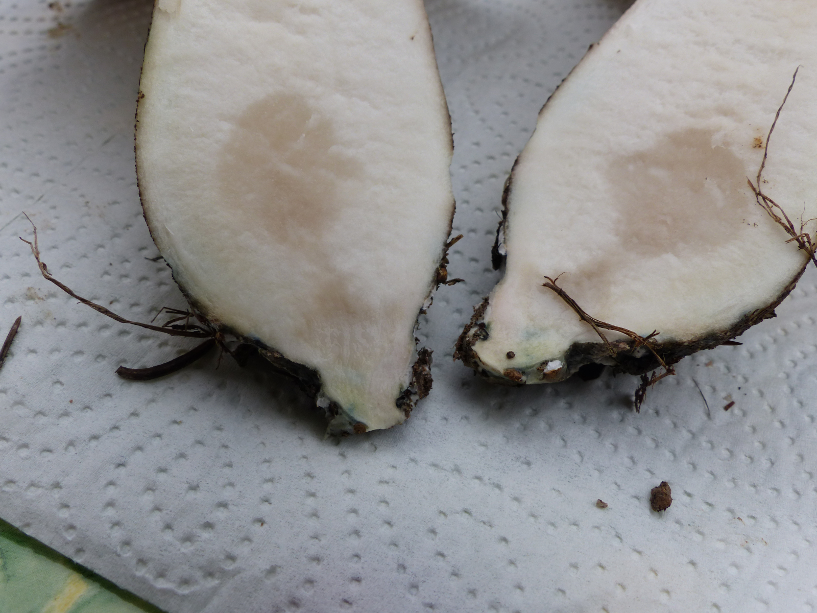 Schnittbild: der Rand der Stielbasis leichter, bläulicher Hauch zu erkennen, cremefarbenes Fruchtfleisch zu erkennen.
