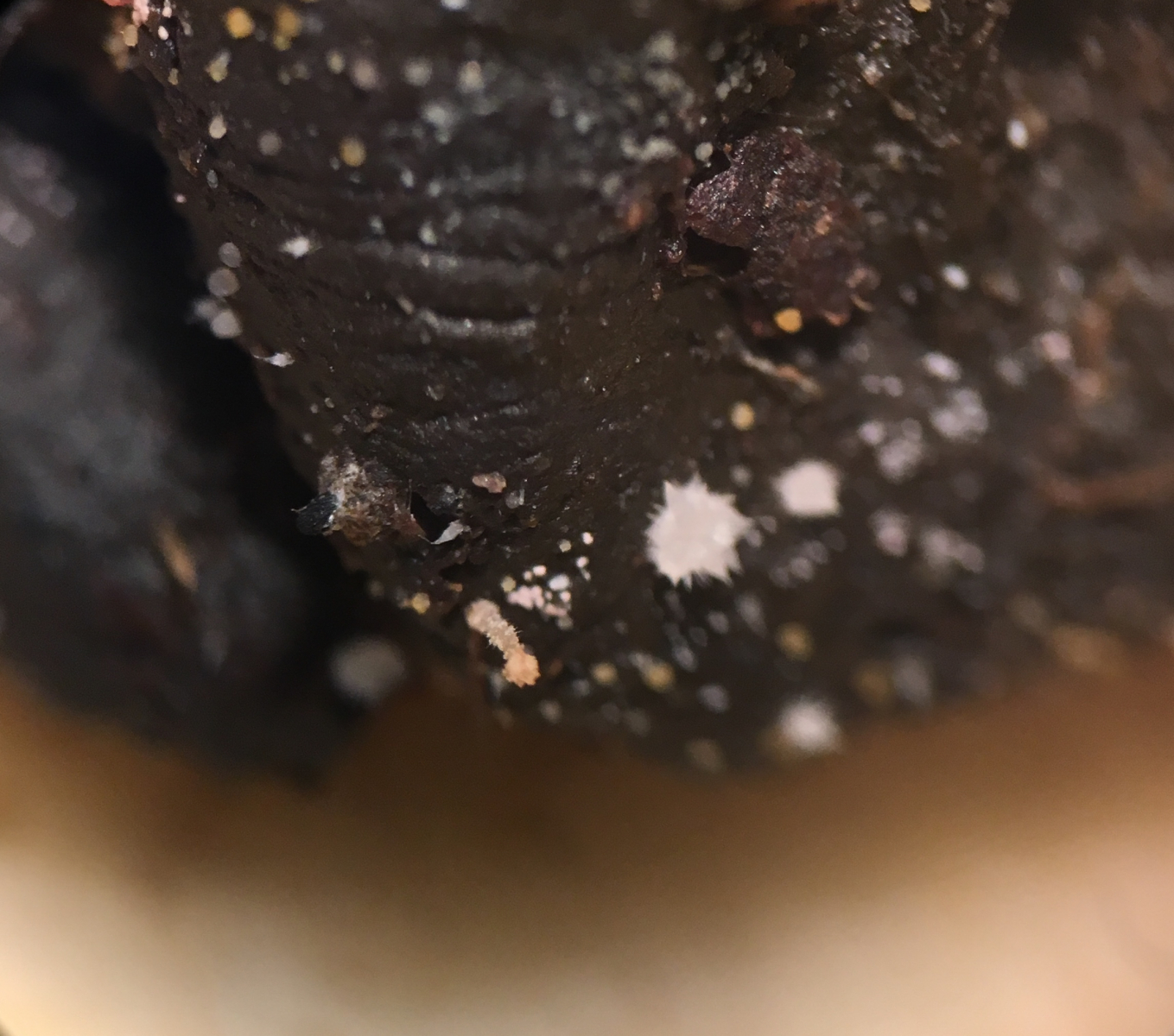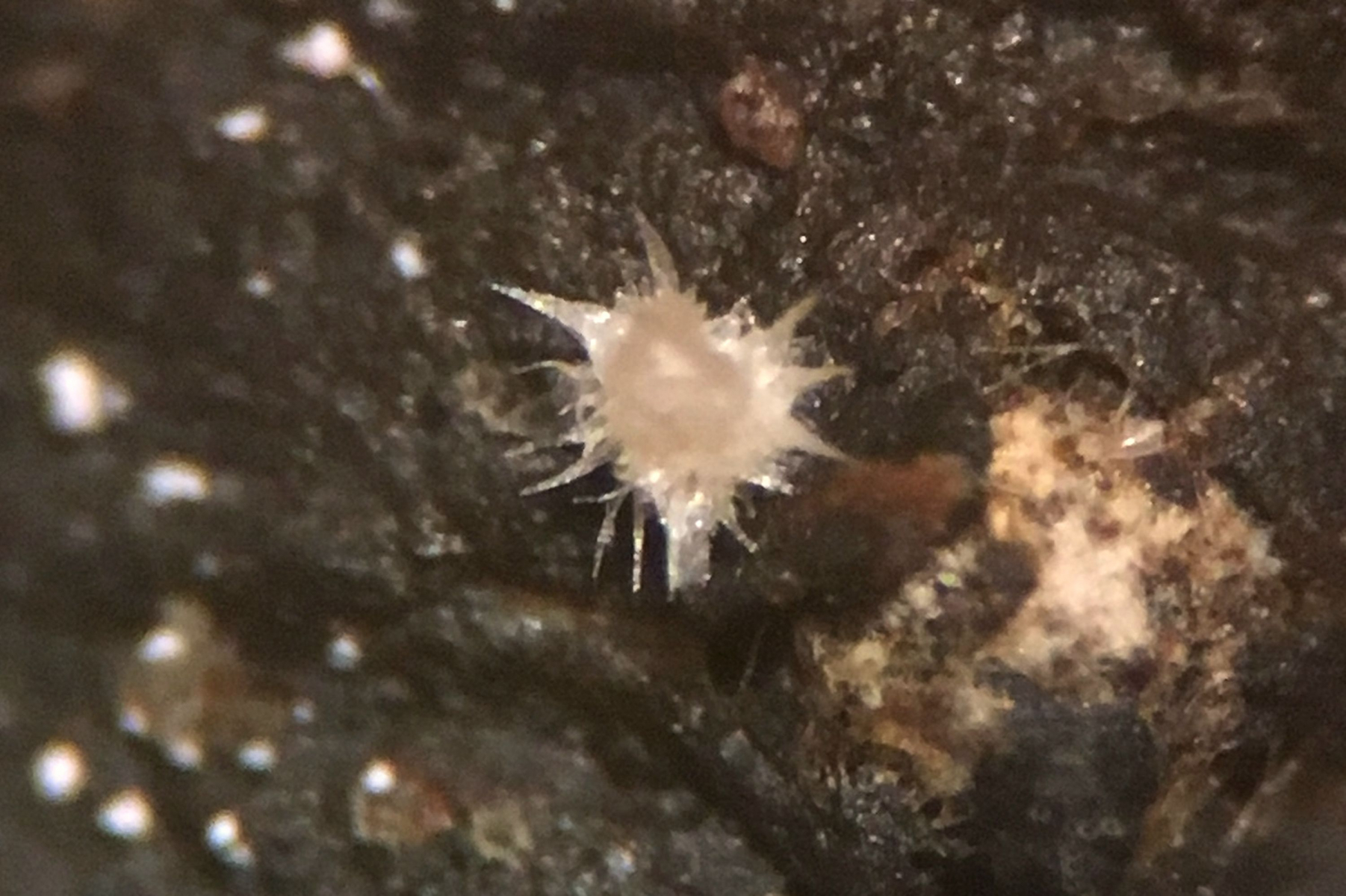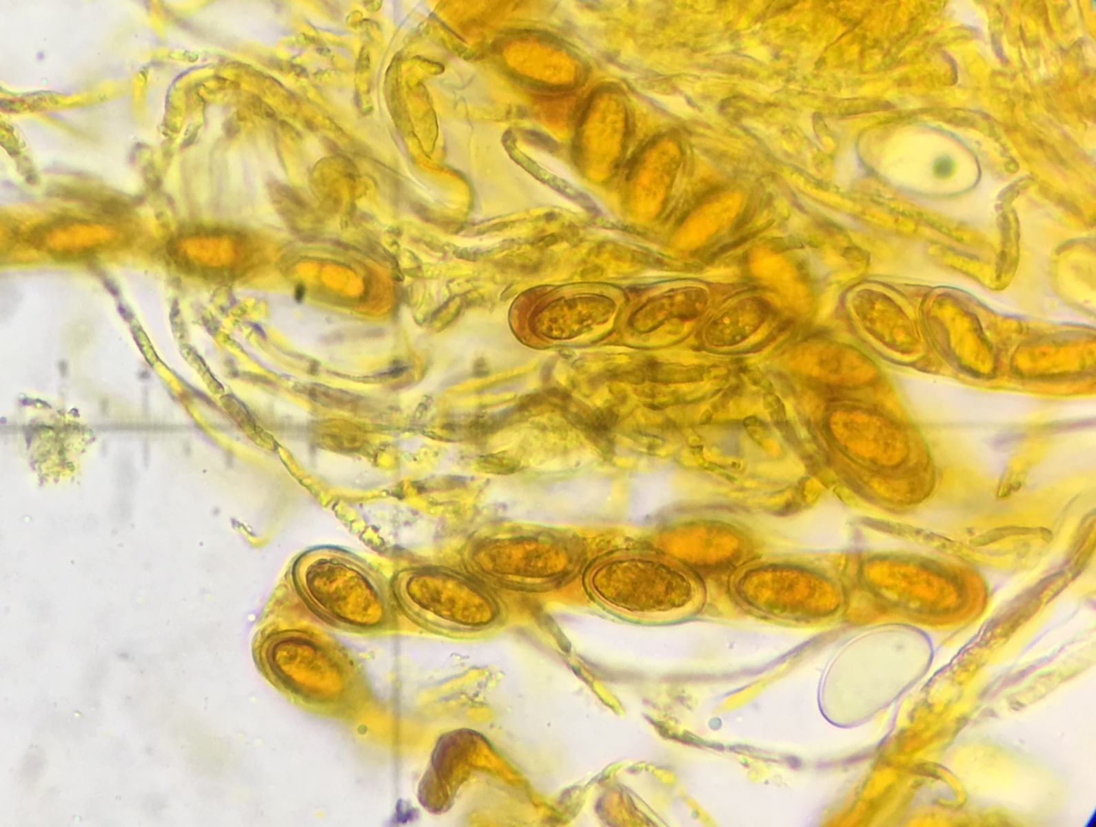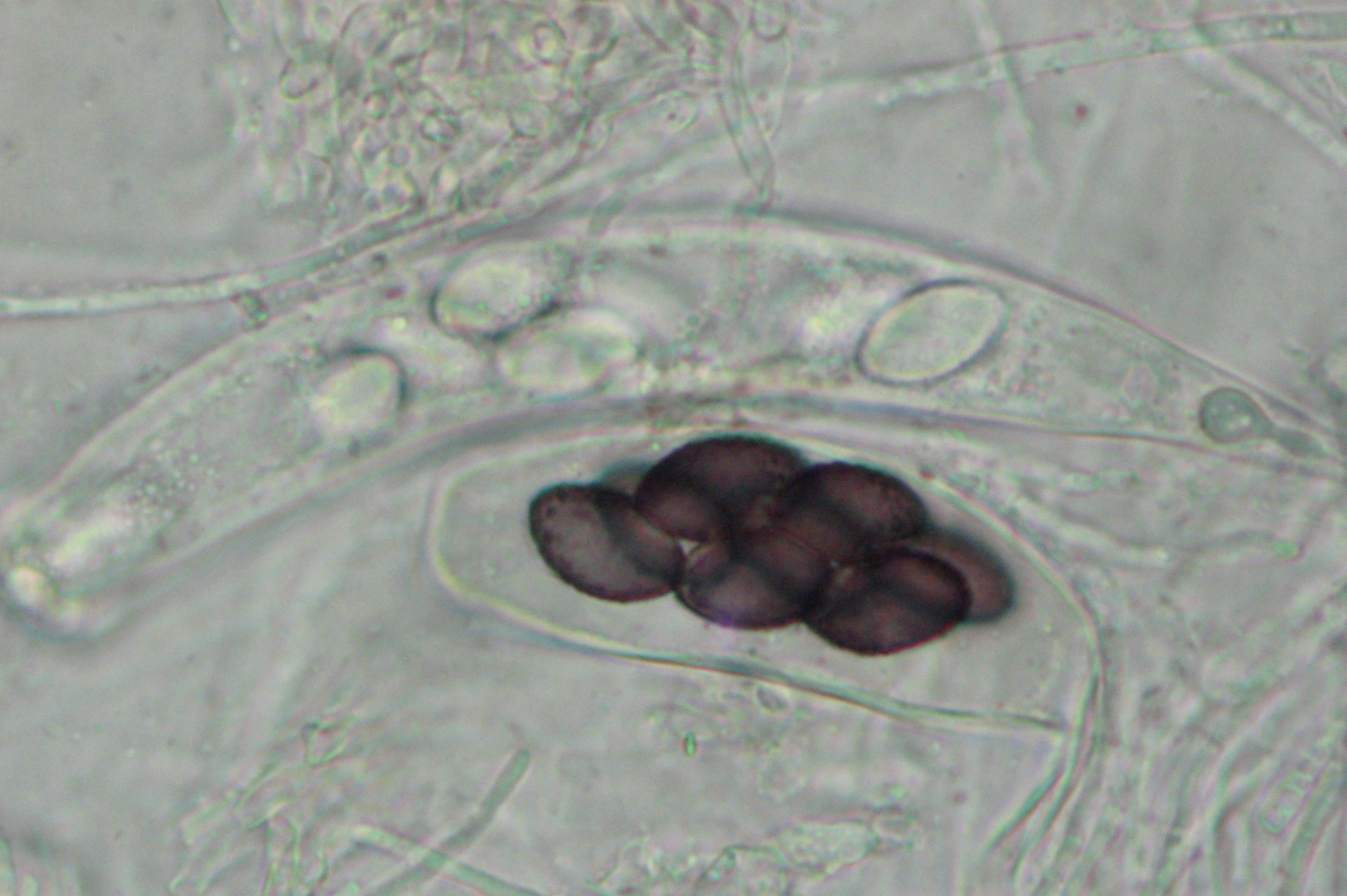 Die Fruchtkörper sind weiße Sterne mit ausgeprägen "Strahlen", zwischen 0.5mm und 1mm. Ascosporen sind etwa 11µm x 6µm. Asci um die 100µm. Die Sporen sind seltsam - es sieht aus also ob die Punkte halb abgefallen sind. Das erinnert mich ein bißchen an Ascobolus degluptus, aber das ist es natürlich nicht. Auf Pflanzenfresserdung von Arizona (einen Monat inkubiert). Ich weiß leider nicht genau welche Tierart. Könnt Ihr mir da weiterhelfen?