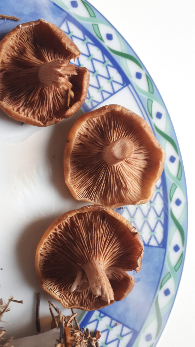 Leider nur kunstlichtbilder. Sporenpulver weiß. Wie beim dunklen gemeinen Halli ein dunklrr Fleck in der Mitte und diese typische Hallimaschhutschuppung. Lg