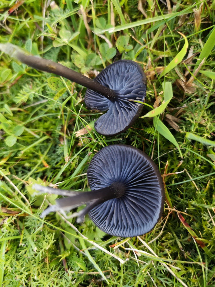Was ich auf deinen Bilder sehe: Sehr dunkle (teils fast schwarze) Fruchtkörper, was schon mal die blasseren Arten mit pigmentierten Cheilozystiden (= blaue oder graue Lamellenschneiden) ausschließt. In den Lamellen sehe ich zumindest auf den Bildern einen deutlichen Blauton (was Beli wohl auch zu der Idee mit Entoloma chalybaeum gebracht hat).