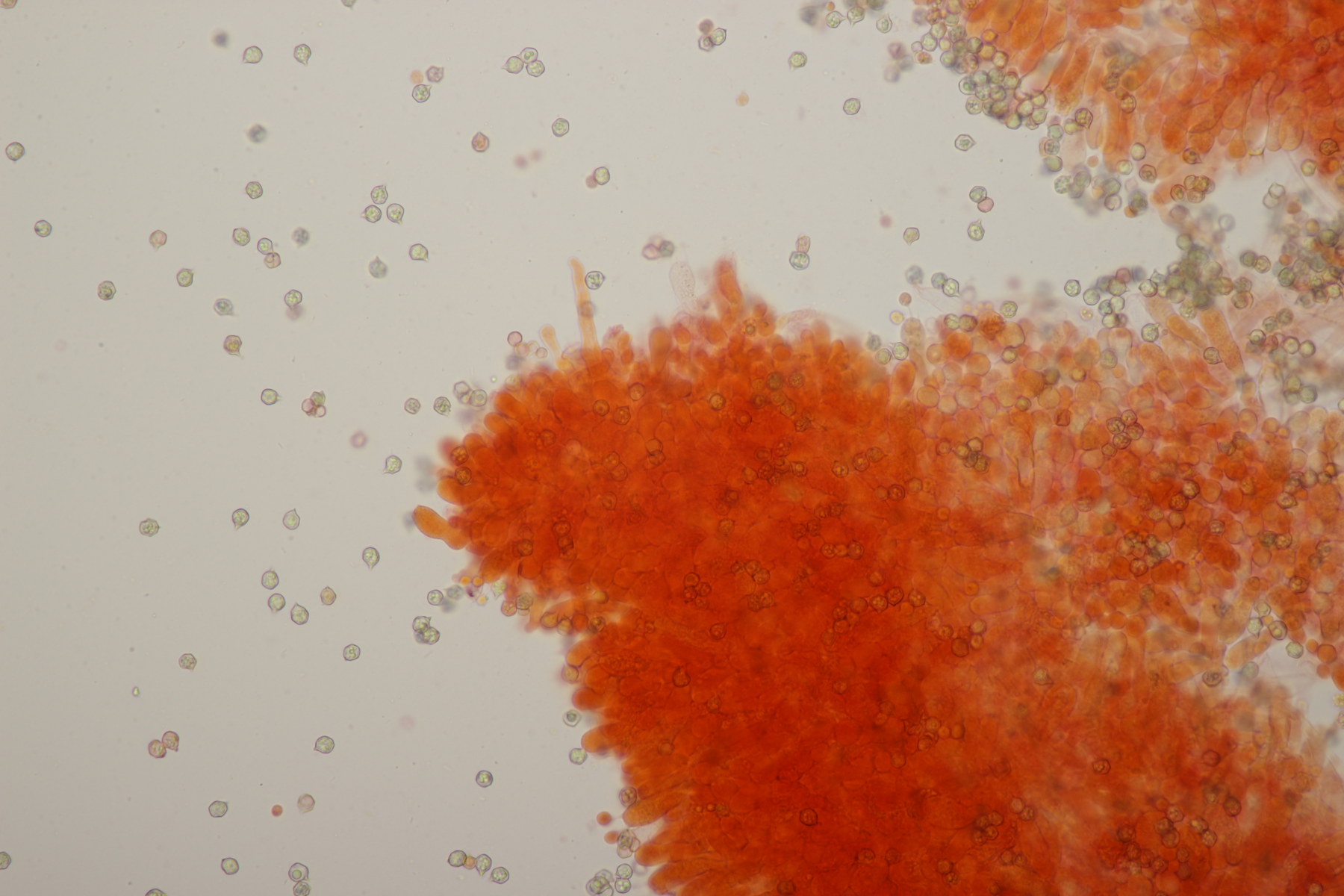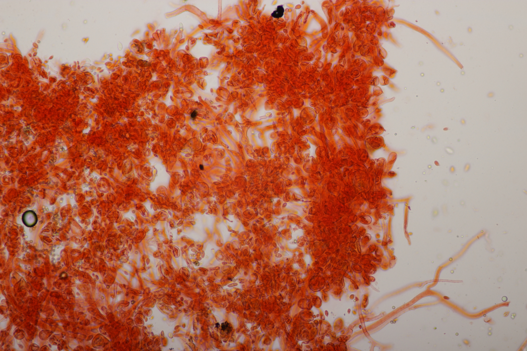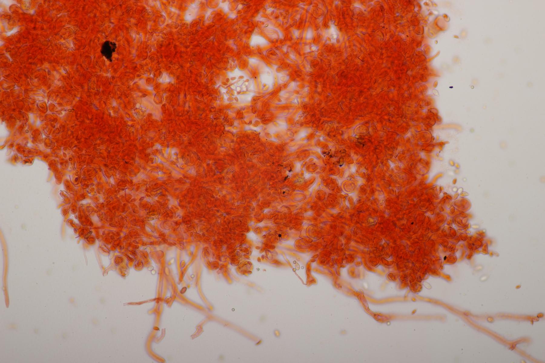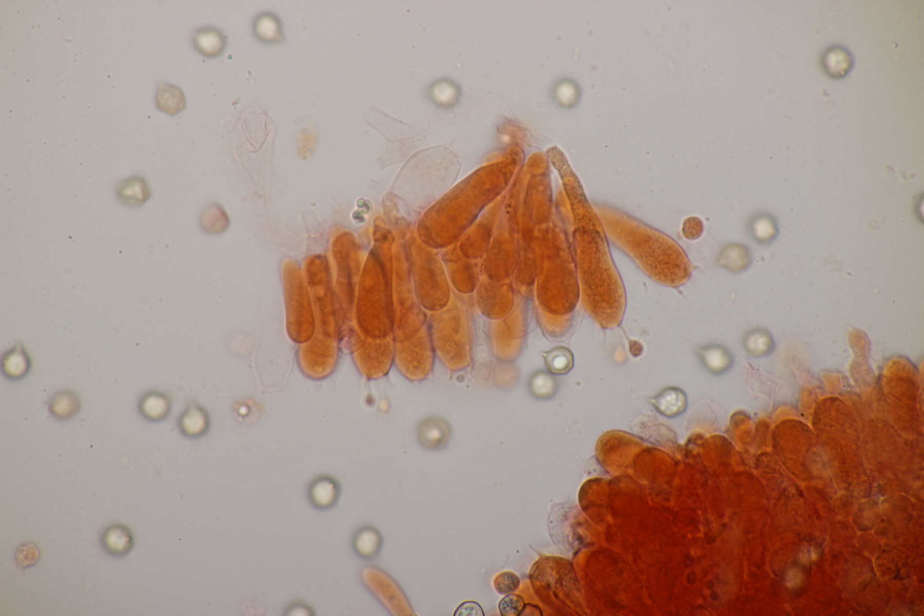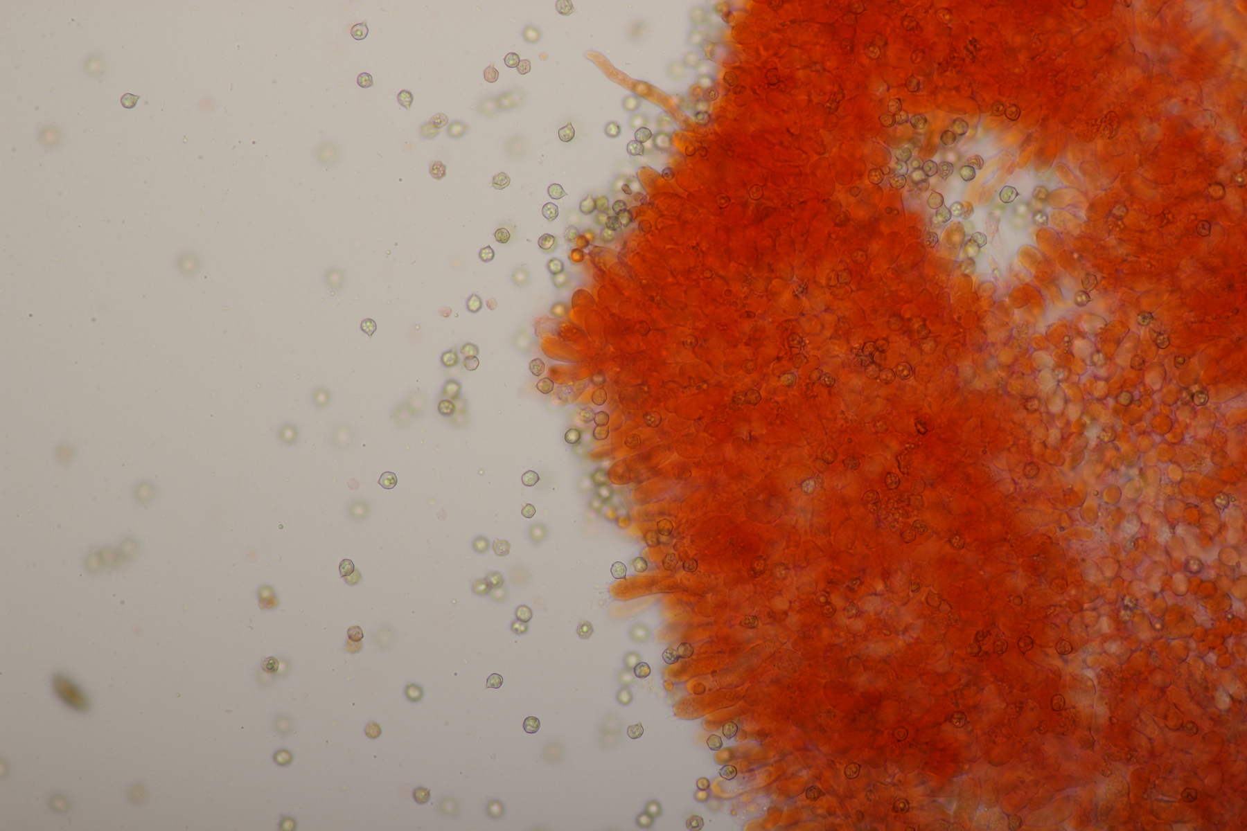 5. Ein kleiner weißer Pilz auf den ich mir aktuell noch keinen Reim machen kann. Mikroskopisch gab er außer den sehr kleinen Sporen auch wenig her: Basidien 4-sporig, Schnallen vorhanden, Zystiden waren nicht zu finden. Hat da jemand eine Idee?
