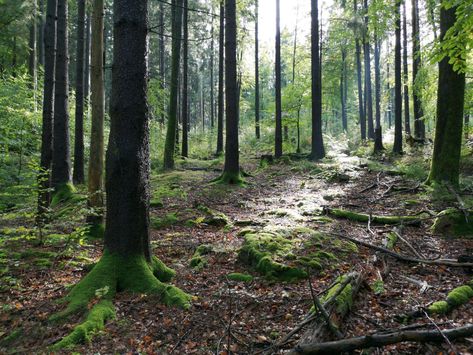 Relativ offen und viel Licht, Untergrund feucht, Nadeln, etwas Laub, Moos in der Nähe.
