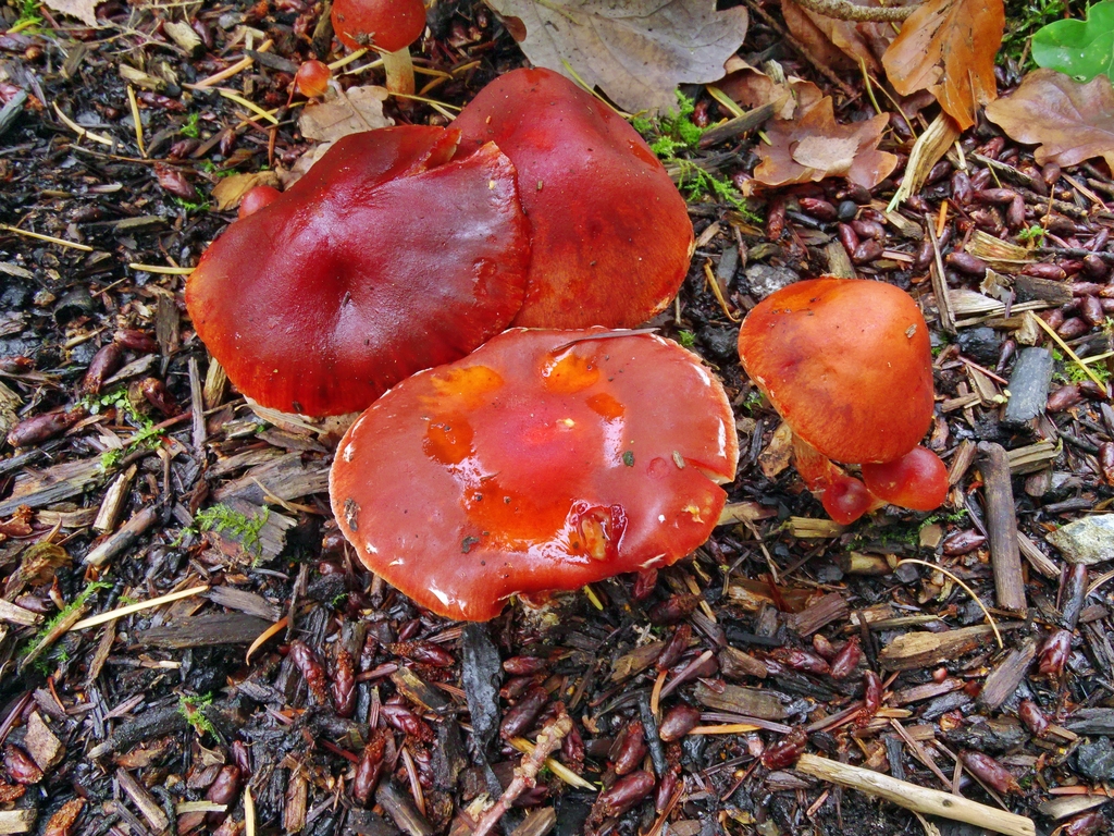 Der Fund stammt von einem großen Friedhof in Hamburg. Dort wurden vor 2 Jahren viel gehäckselte Holzreste unter Büschen und an Wegrändern ausgebracht. Seither wuchs dort garnichts. Nach dem tagelangen Regen Ende September fand dort aber eine Massenentfaltung von Pilzen statt (Coprinus, Psathyrella) und vorallem diese Art Stropharia aurantiaca. Ich hatte die noch nie gesehen, aber die Merkmale sind so charakteristisch, dass kein Zweifel besteht. Nach Literatur (Großpilze BW Bd. 4) ist die Art invasiv. Ich poste diesen Beitrag daher, um zu zeigen, dass die Art jetzt hier angekommen ist.