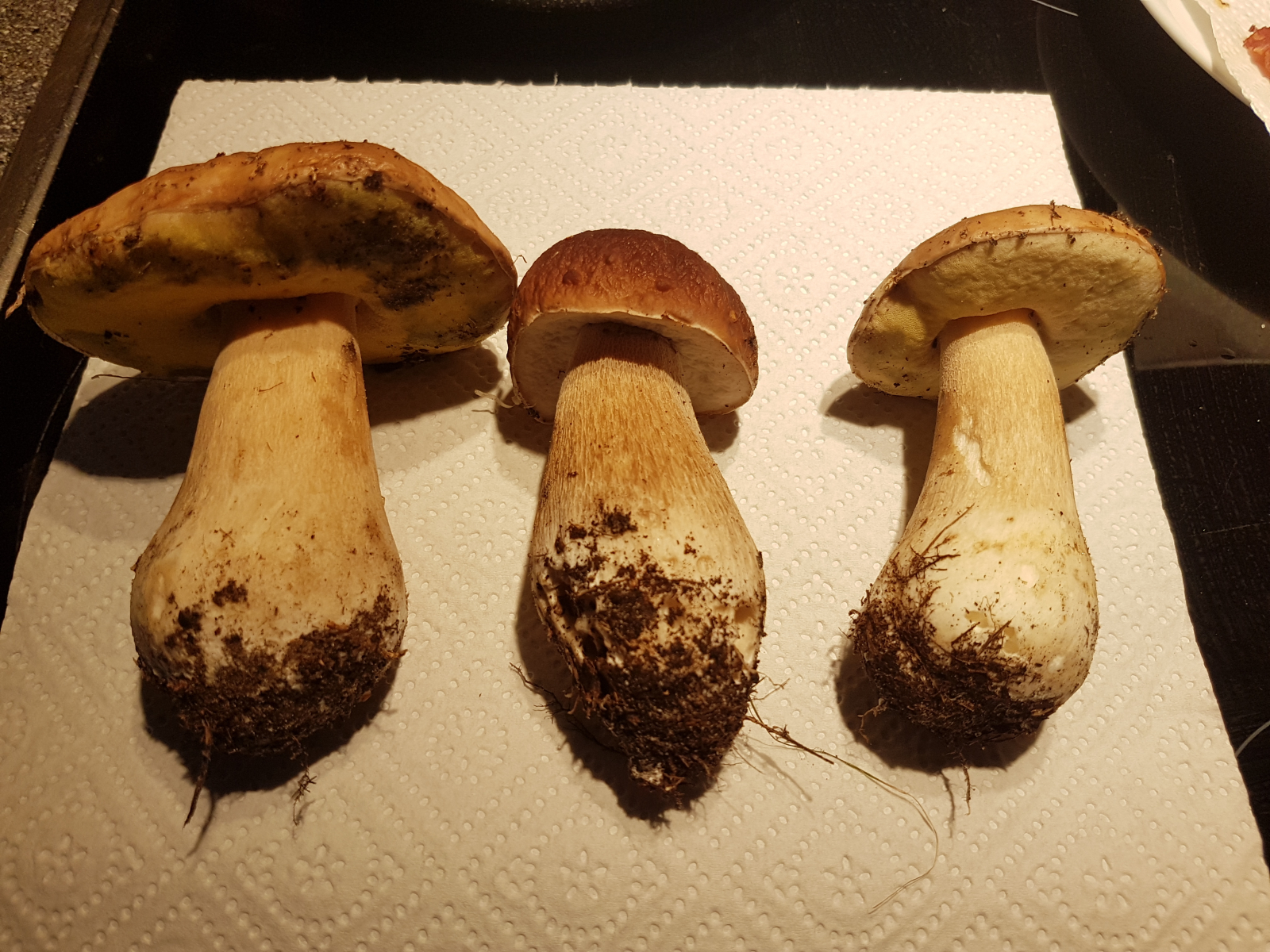 Heute hab ich ne Frage. Hab diese Steinpilze gesammelt. Symbiose Baum müsste ne Birke sein. Hab von blauenden Steinpilzen bereits gelesen, sowie von Birkensteinpilzen. Eine 50 cm große ,,Eiche'' wuchs nebenan. Die beiden äußeren sind deutlich weicher als der in der Mitte. Die Stielung ist auffällig anders beim mittleren Exemplar.