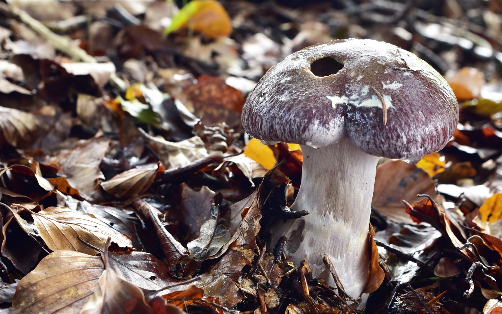 - Hut (nach Regen) schmierig, Farbton bräunlich bis braunviolett, leicht marmoriert würde ich sagen, teilweise mit weißen Flöckchen im Randbereich