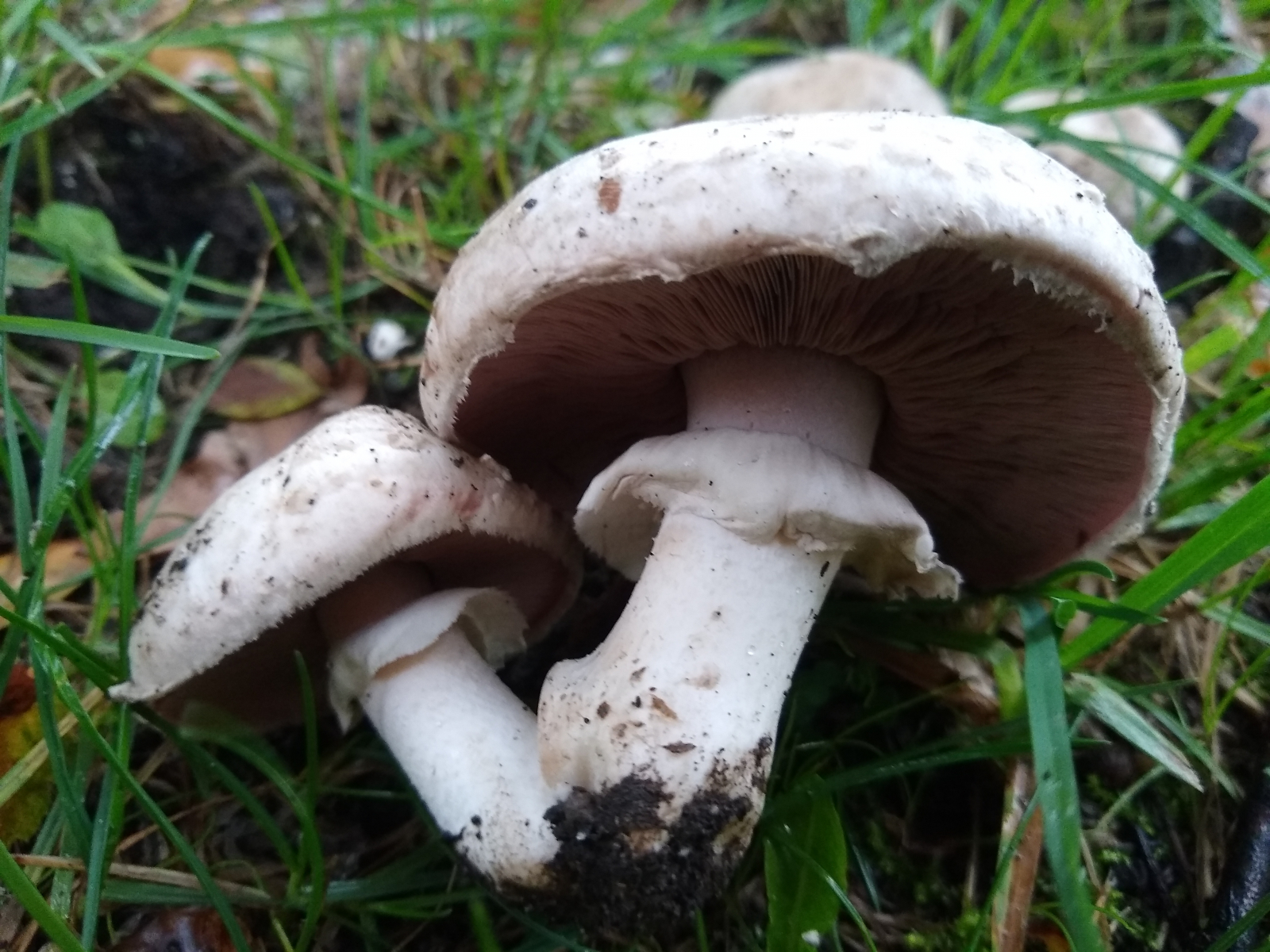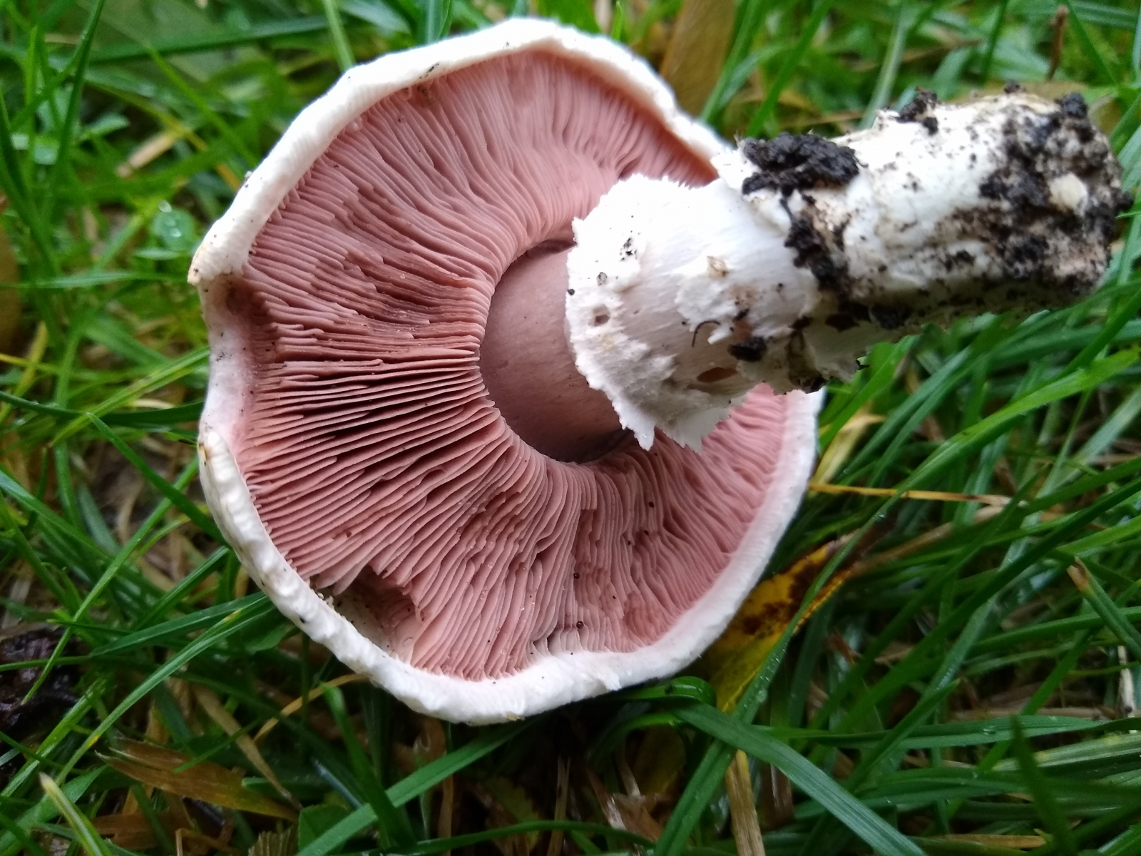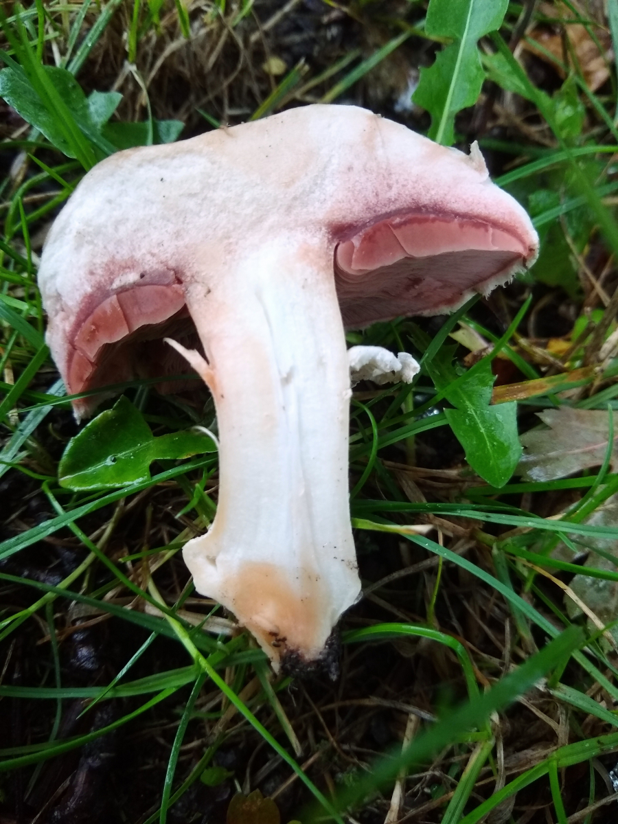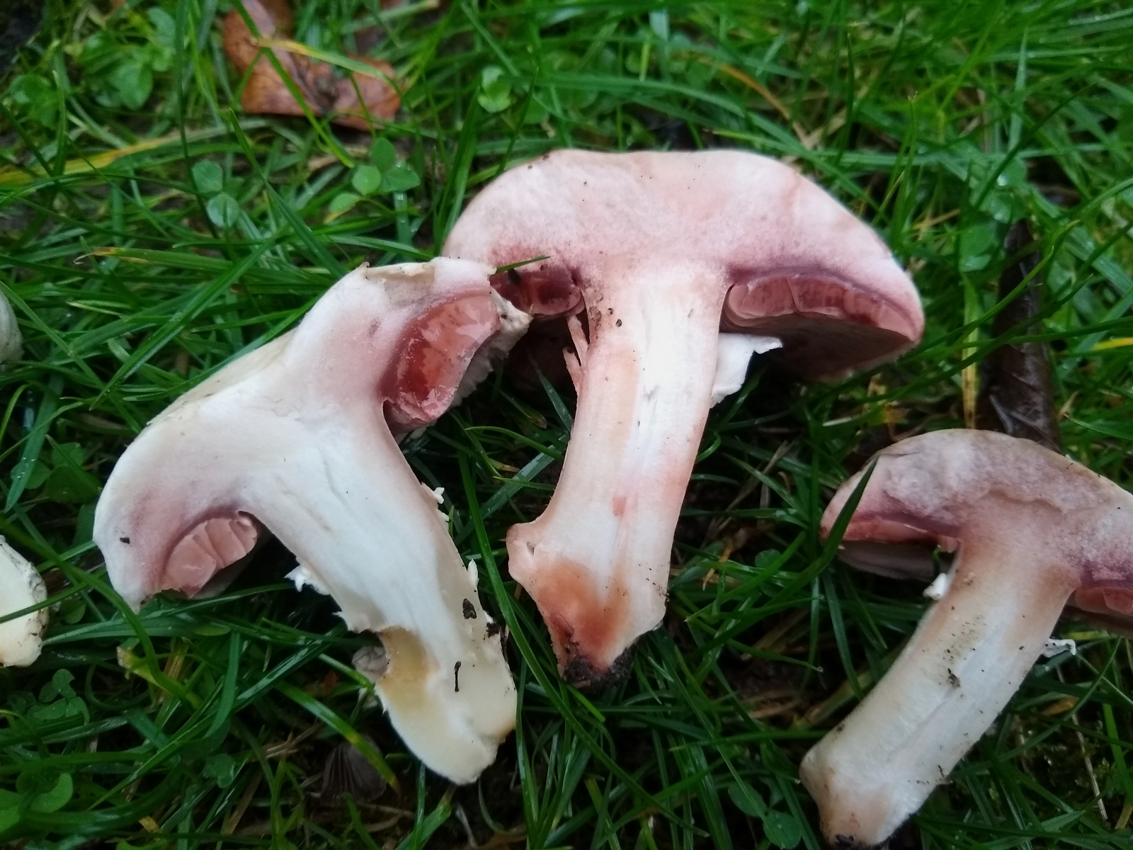 vor ein paar Tagen fand ich bei strömendem Regen am Wegrand einer Parkanlage in Hannover folgende Champignons. Wie so oft konnte ich sie nicht bestimmen und hatte auch erstmal keine Idee. In der Basis gilbte zunächst ein Exemplar recht stark, den Stiel aufsteigend schwach. Im Hutfleisch rötete der FK direkt. Trotz stömenden Regens untersuchte ich weitere FK am Standort recht ausgiebig, die tw. ein ähnliches, aber schwächeres Färbemuster zeigten. Intensives Beschnuppern erbrachte keinen auffälligen Geruch und als ich ein wenig umhergegangen war und vielleicht zwei Minuten vergangen waren, wendete ich mich wieder dem Exemplar mit dem starken Basisgilben zu, das sich jetzt orange verfärbt hatte. Binnen der folgenden 5min schlug das vormalige Gelb in kräftiges Rot um. Die gesamte Trama des FK rötete jetzt mehr oder weniger.