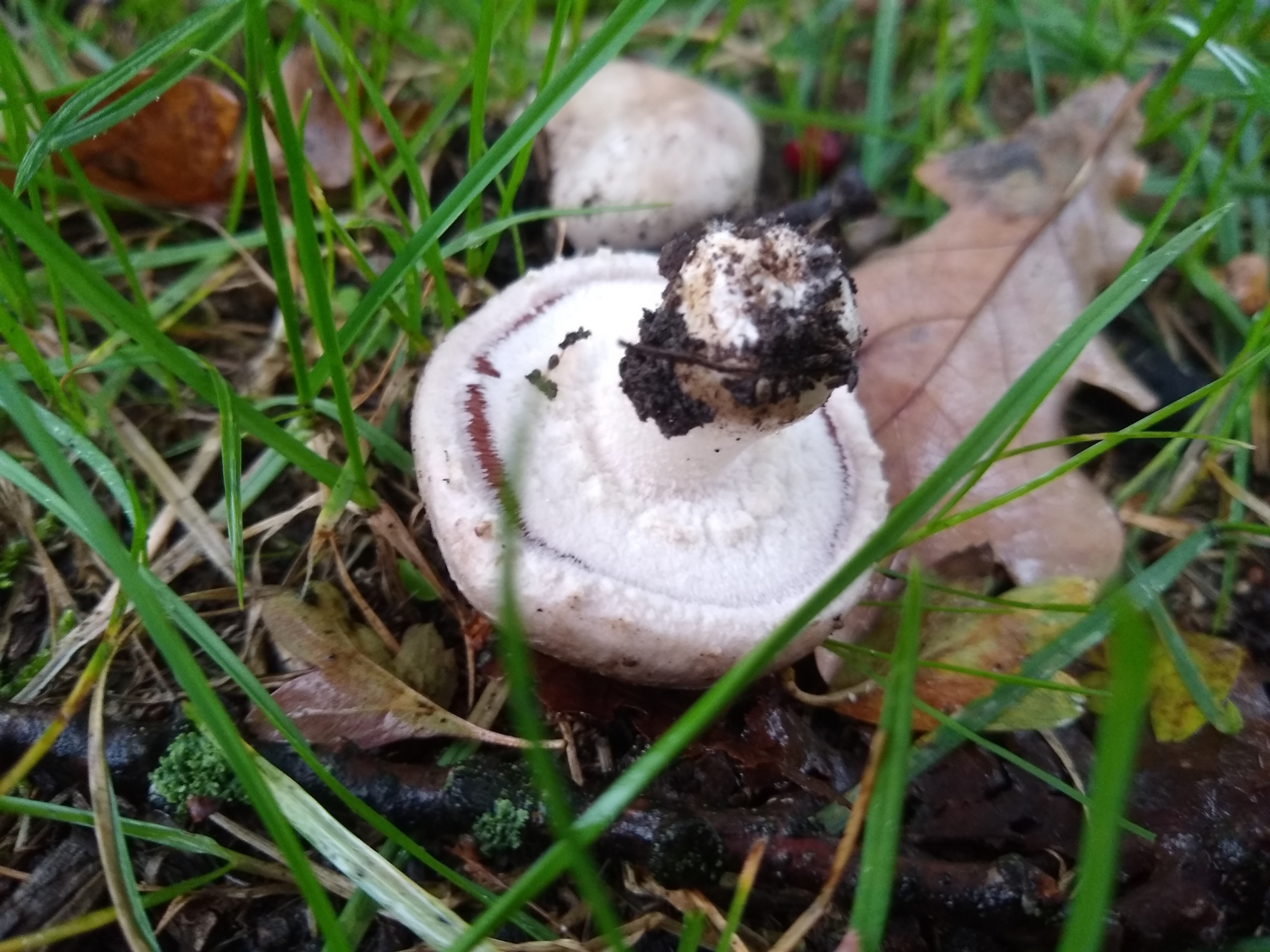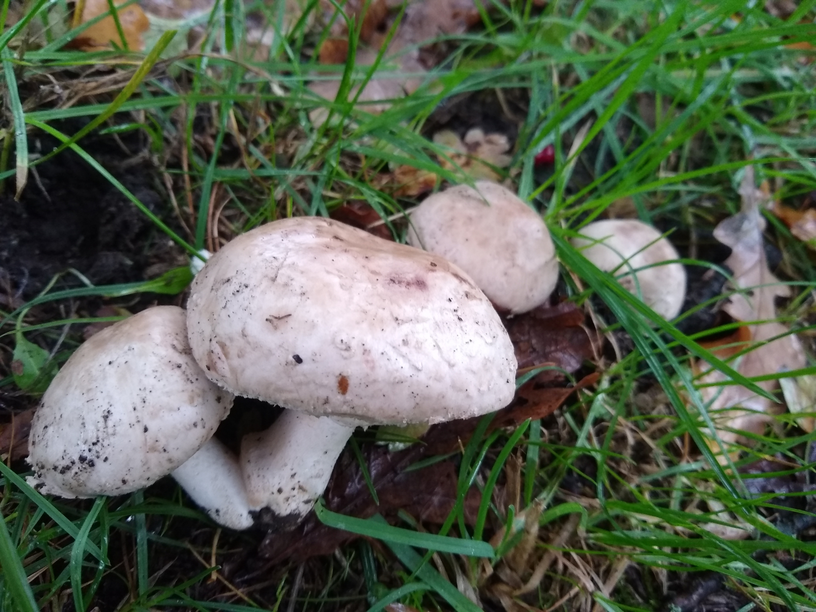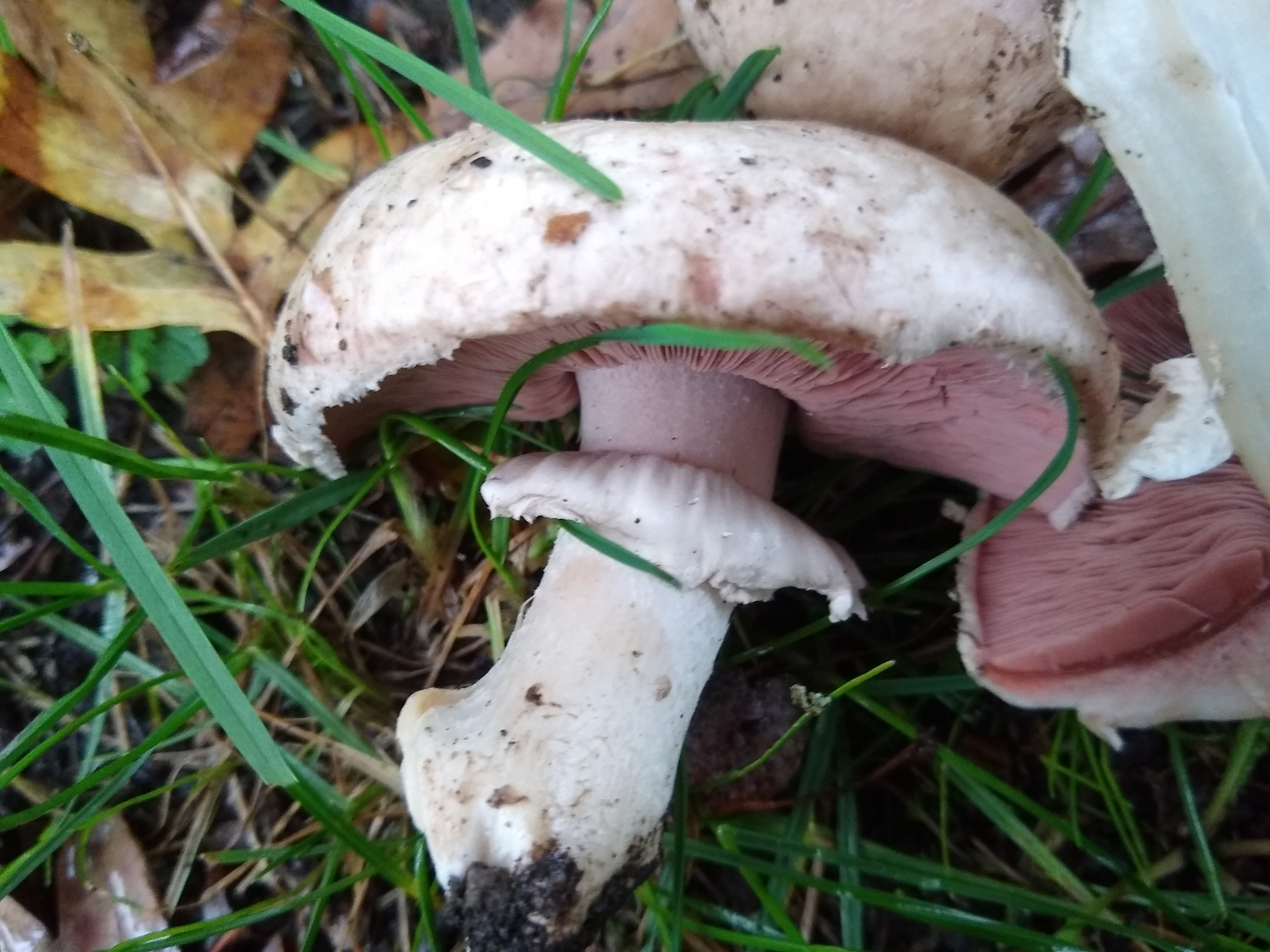 vor ein paar Tagen fand ich bei strömendem Regen am Wegrand einer Parkanlage in Hannover folgende Champignons. Wie so oft konnte ich sie nicht bestimmen und hatte auch erstmal keine Idee. In der Basis gilbte zunächst ein Exemplar recht stark, den Stiel aufsteigend schwach. Im Hutfleisch rötete der FK direkt. Trotz stömenden Regens untersuchte ich weitere FK am Standort recht ausgiebig, die tw. ein ähnliches, aber schwächeres Färbemuster zeigten. Intensives Beschnuppern erbrachte keinen auffälligen Geruch und als ich ein wenig umhergegangen war und vielleicht zwei Minuten vergangen waren, wendete ich mich wieder dem Exemplar mit dem starken Basisgilben zu, das sich jetzt orange verfärbt hatte. Binnen der folgenden 5min schlug das vormalige Gelb in kräftiges Rot um. Die gesamte Trama des FK rötete jetzt mehr oder weniger.