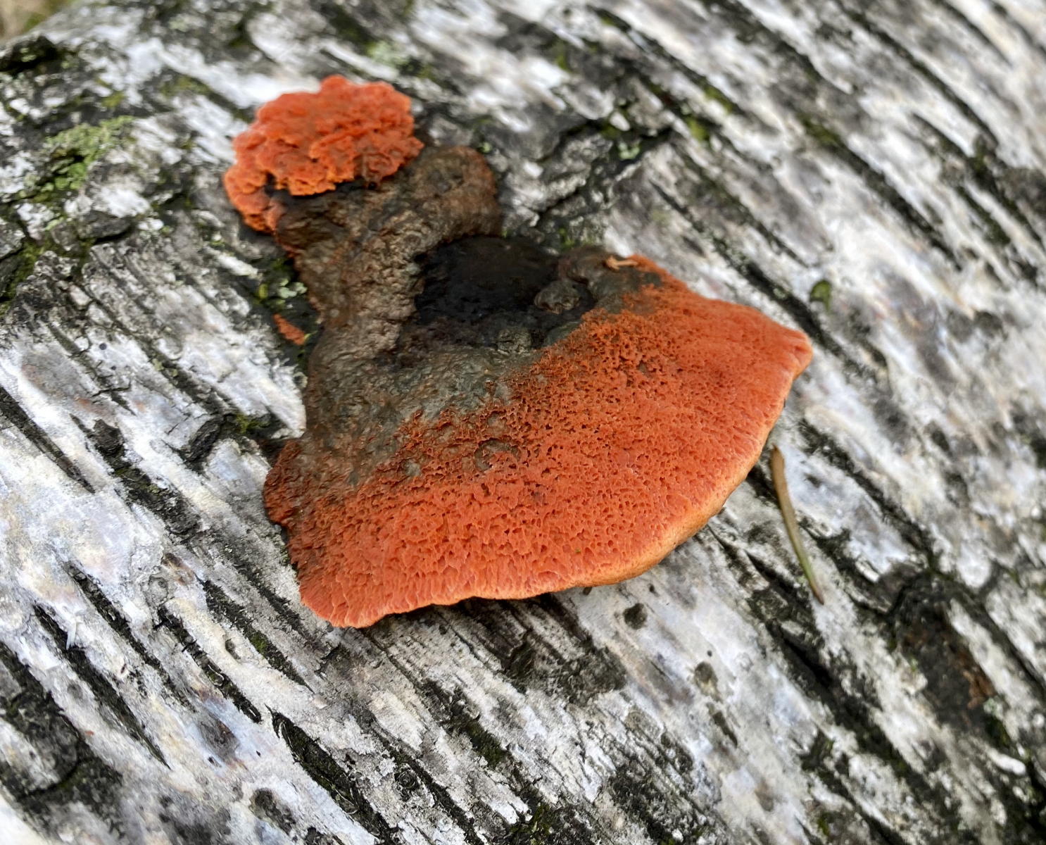 Pycnoporellus fulgens kann auch selten mal Laubholz besiedeln, aber da passt das Farbspektrum nicht.LG; Pablo.