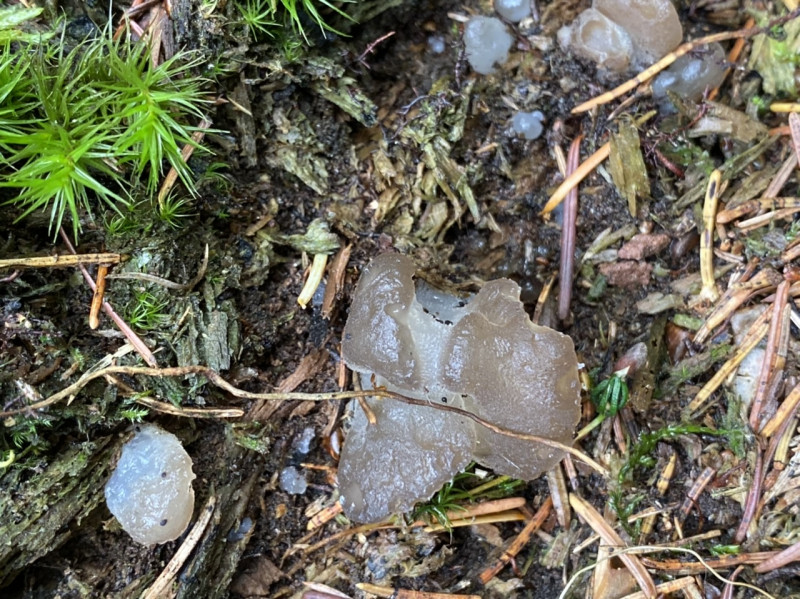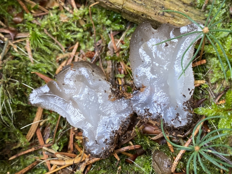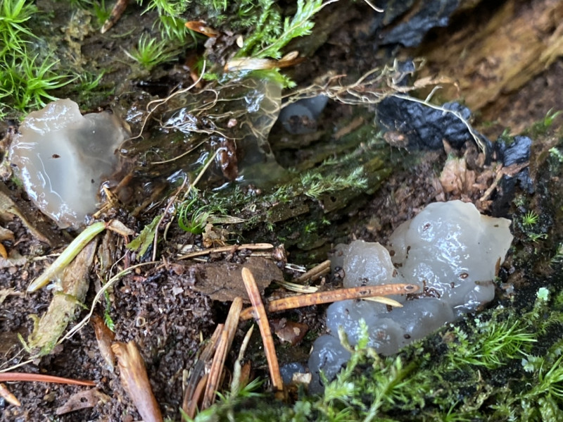Sieht nach vergammeltem Zitterzahn Pseudohydnum gelatinosum aus , da passt auch das Substrat.