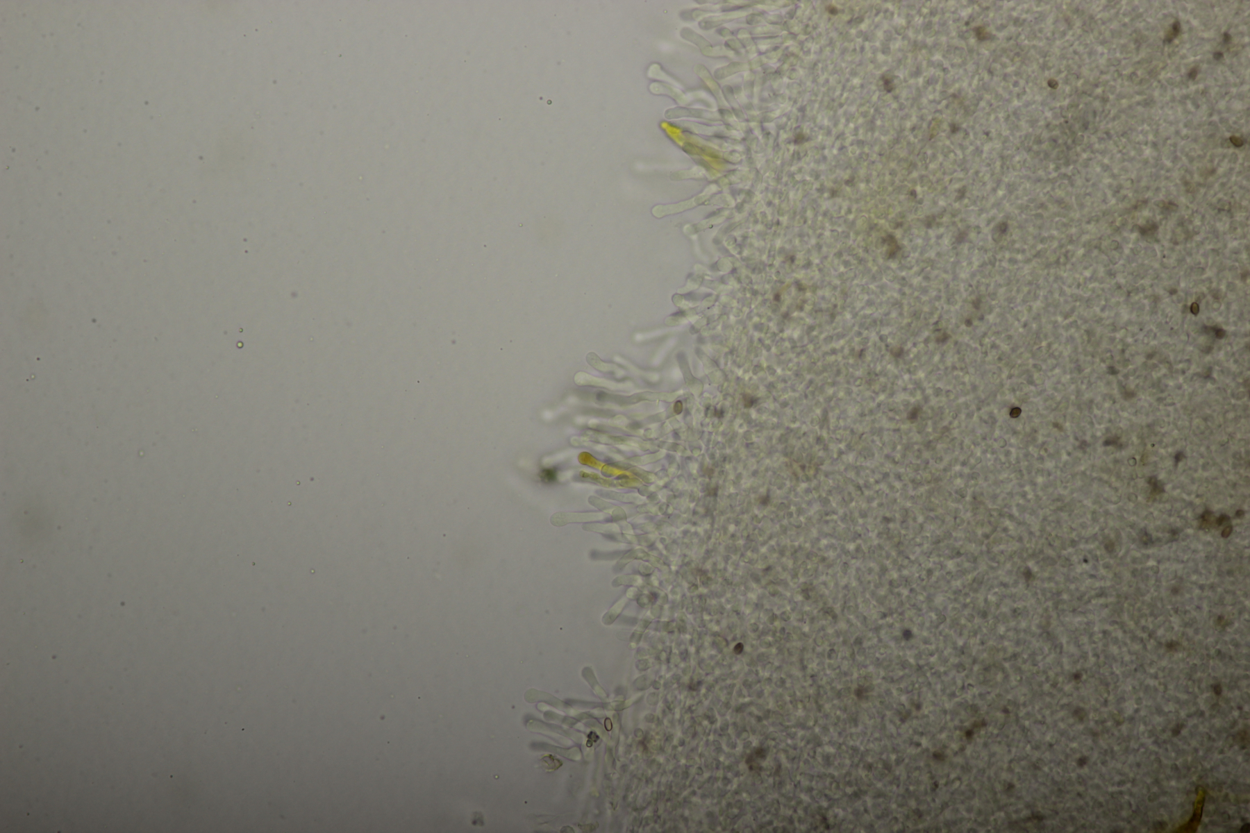 Lamellenschneide: Cheilozystiden vorhanden, man erkennt außerdem eine braune Verfärbung