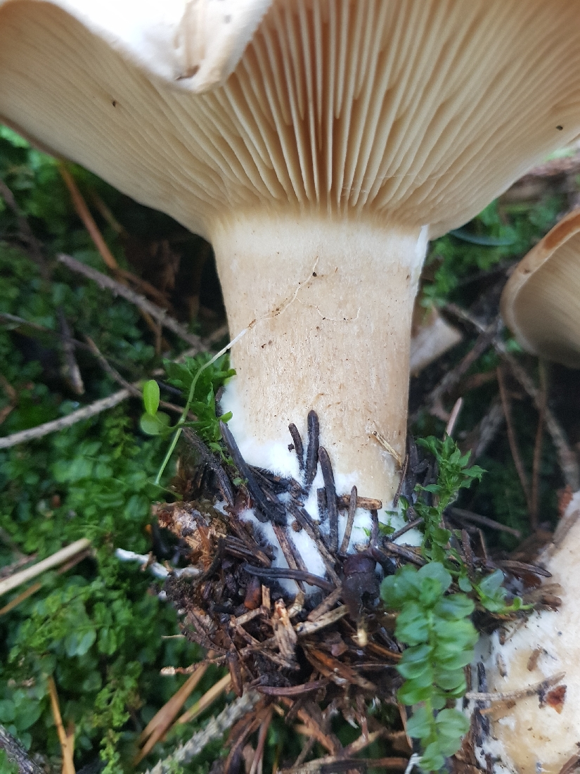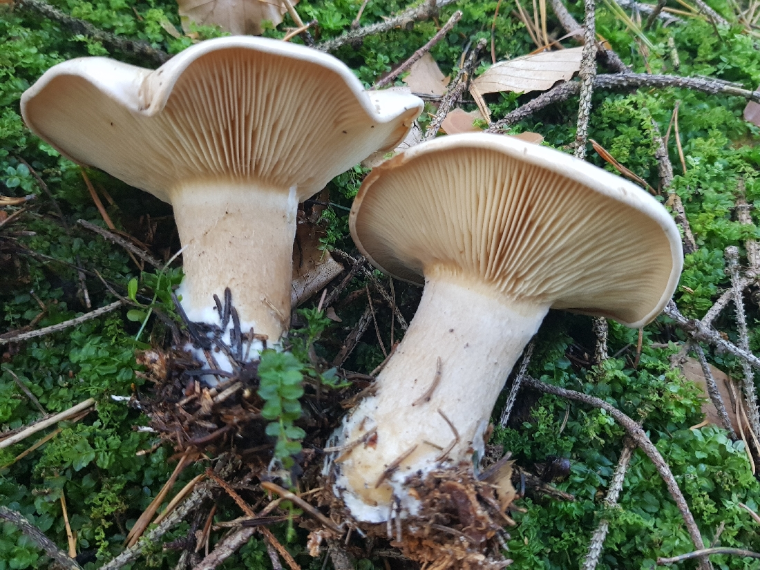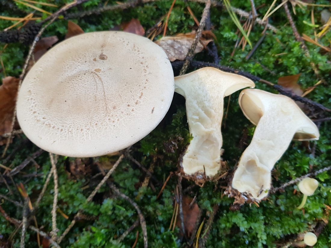 Der folgende Fund Fund von gestern lässt mich noch etwas ratlos zurück. Gefunden im Fichtenwald auf Kalk. Wuchs in einer größeren Gruppe im Hexenring. Grundsätzlich erinnert mich die Statur, Farben und (zumindest entfernt) der Geruch an den Mönchskopf; diesen kenne ich aber nicht mit einem derartig stämmigen Stiel, außerdem fehlt der Buckel. Ein eine andere Clitocybe? Oder Leucopaxillus? Ich Freue mich über Anregungen.