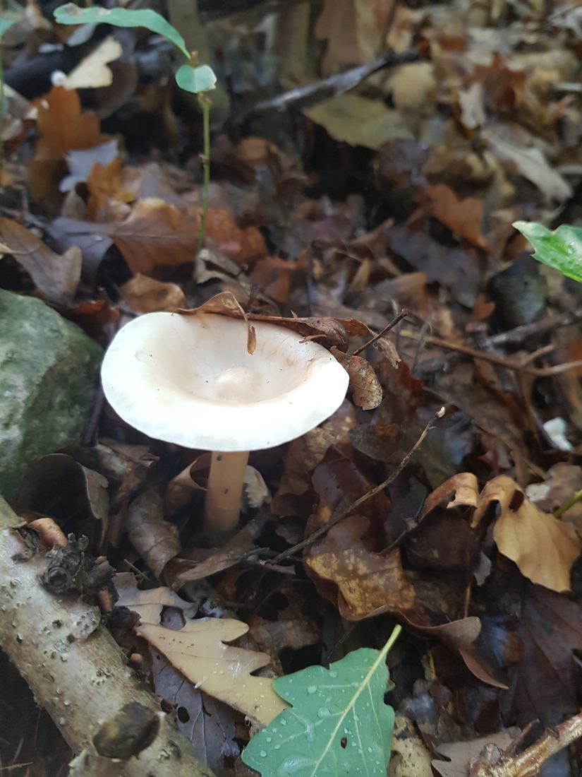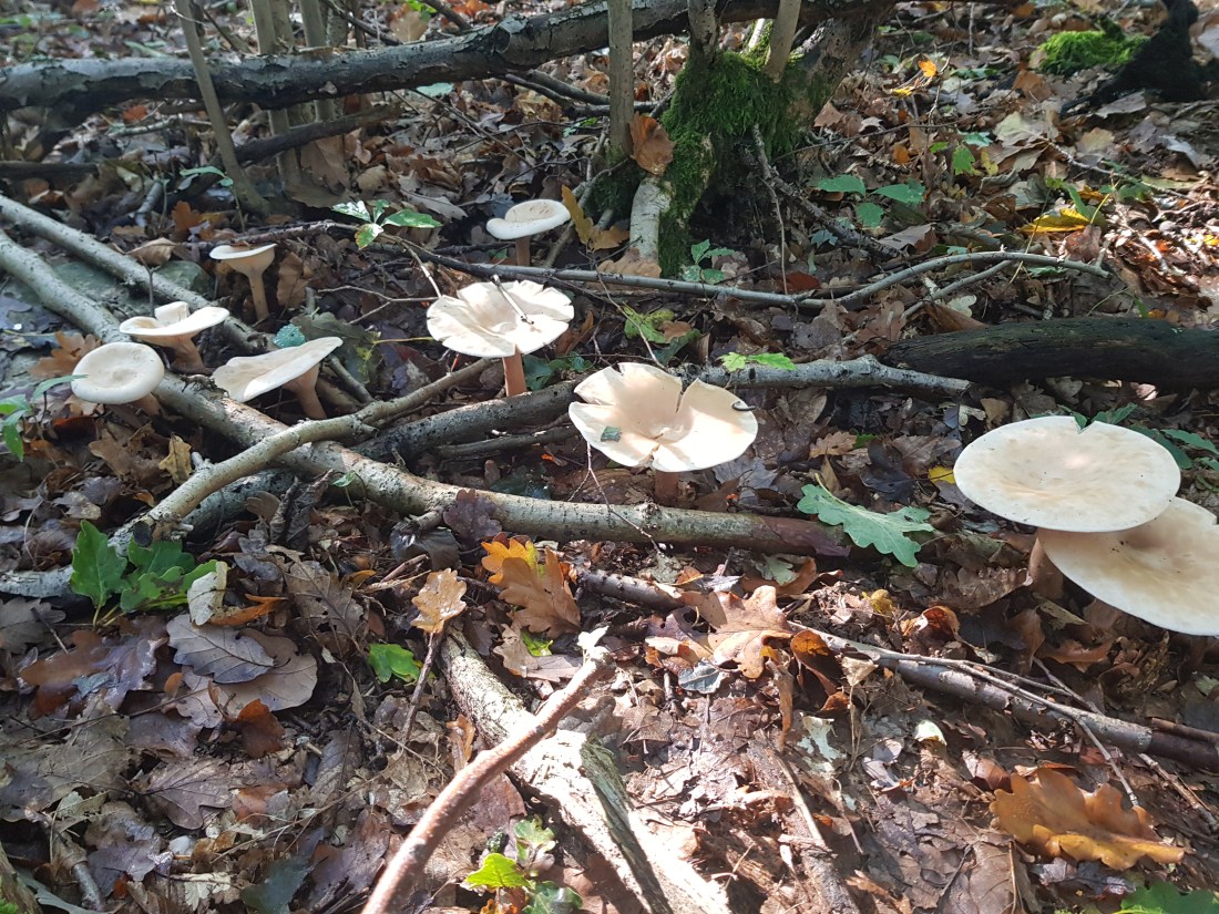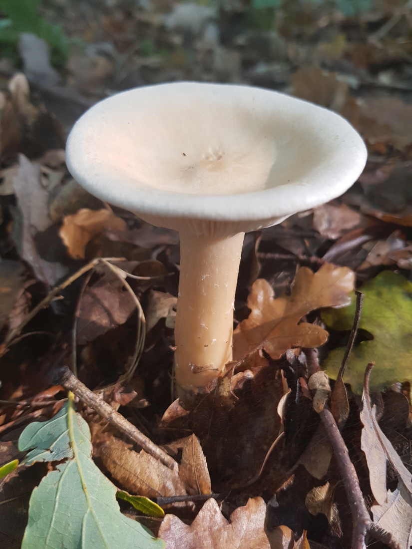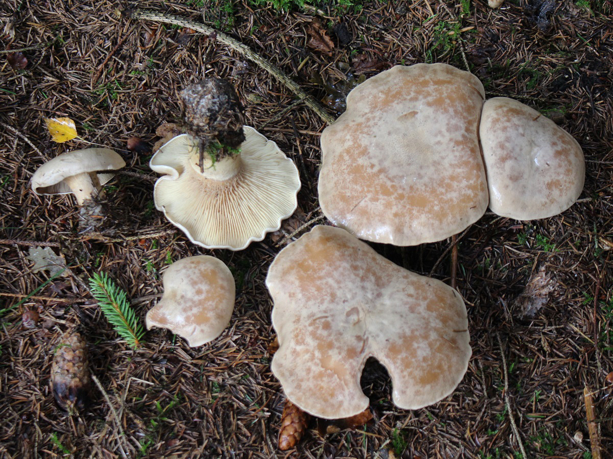 Der folgende Fund Fund von gestern lässt mich noch etwas ratlos zurück. Gefunden im Fichtenwald auf Kalk. Wuchs in einer größeren Gruppe im Hexenring. Grundsätzlich erinnert mich die Statur, Farben und (zumindest entfernt) der Geruch an den Mönchskopf; diesen kenne ich aber nicht mit einem derartig stämmigen Stiel, außerdem fehlt der Buckel. Ein eine andere Clitocybe? Oder Leucopaxillus? Ich Freue mich über Anregungen.