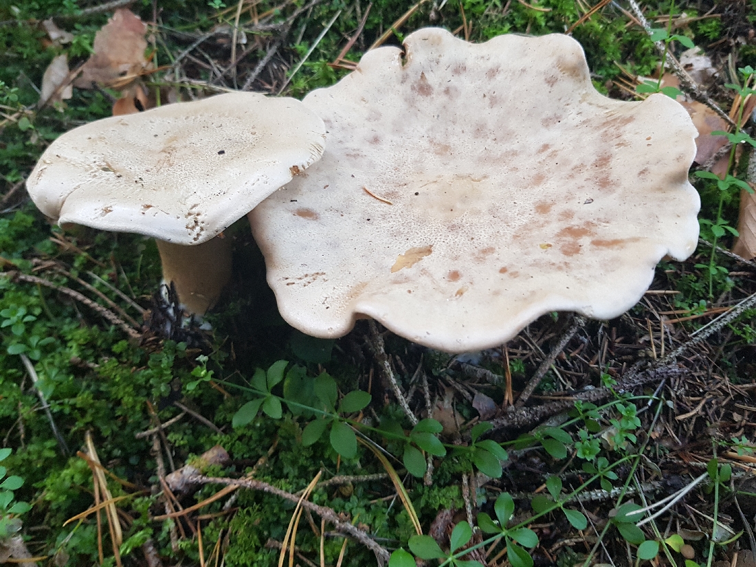 Der folgende Fund Fund von gestern lässt mich noch etwas ratlos zurück. Gefunden im Fichtenwald auf Kalk. Wuchs in einer größeren Gruppe im Hexenring. Grundsätzlich erinnert mich die Statur, Farben und (zumindest entfernt) der Geruch an den Mönchskopf; diesen kenne ich aber nicht mit einem derartig stämmigen Stiel, außerdem fehlt der Buckel. Ein eine andere Clitocybe? Oder Leucopaxillus? Ich Freue mich über Anregungen.